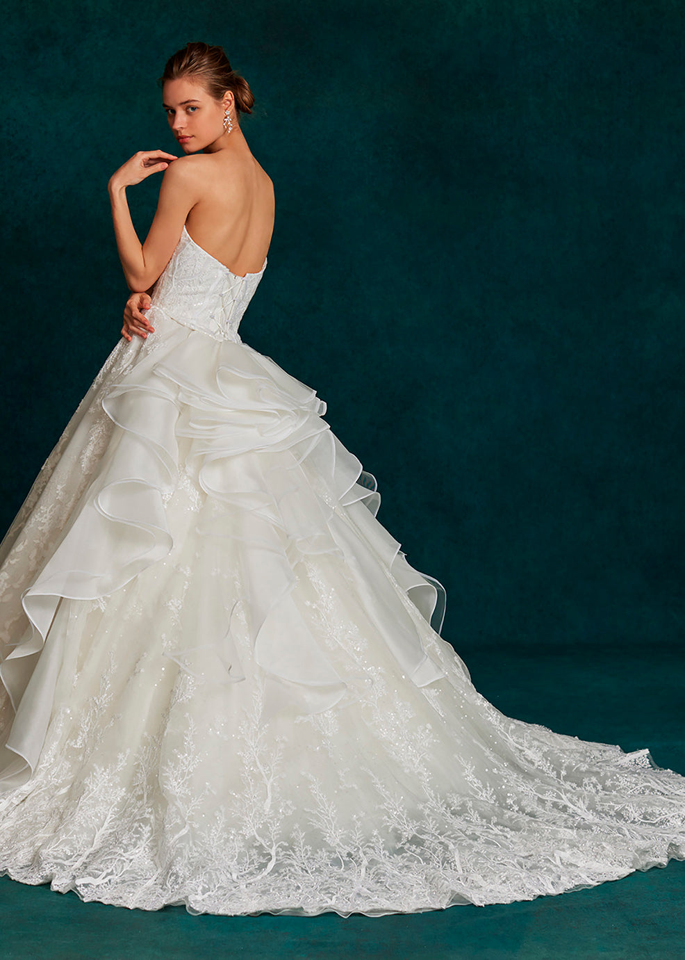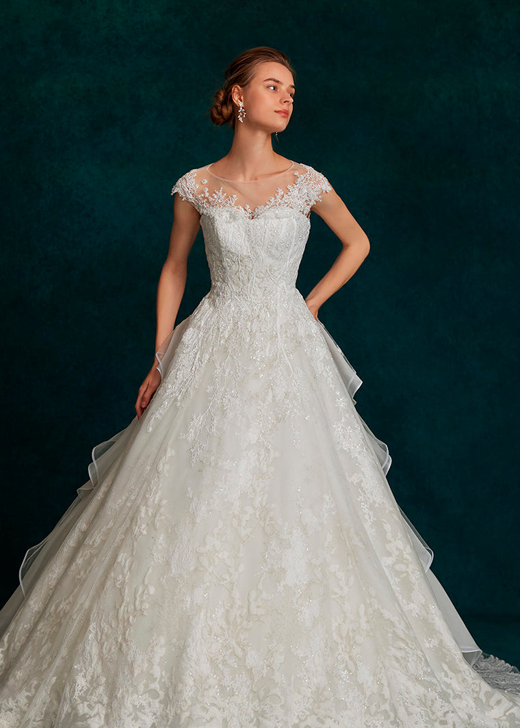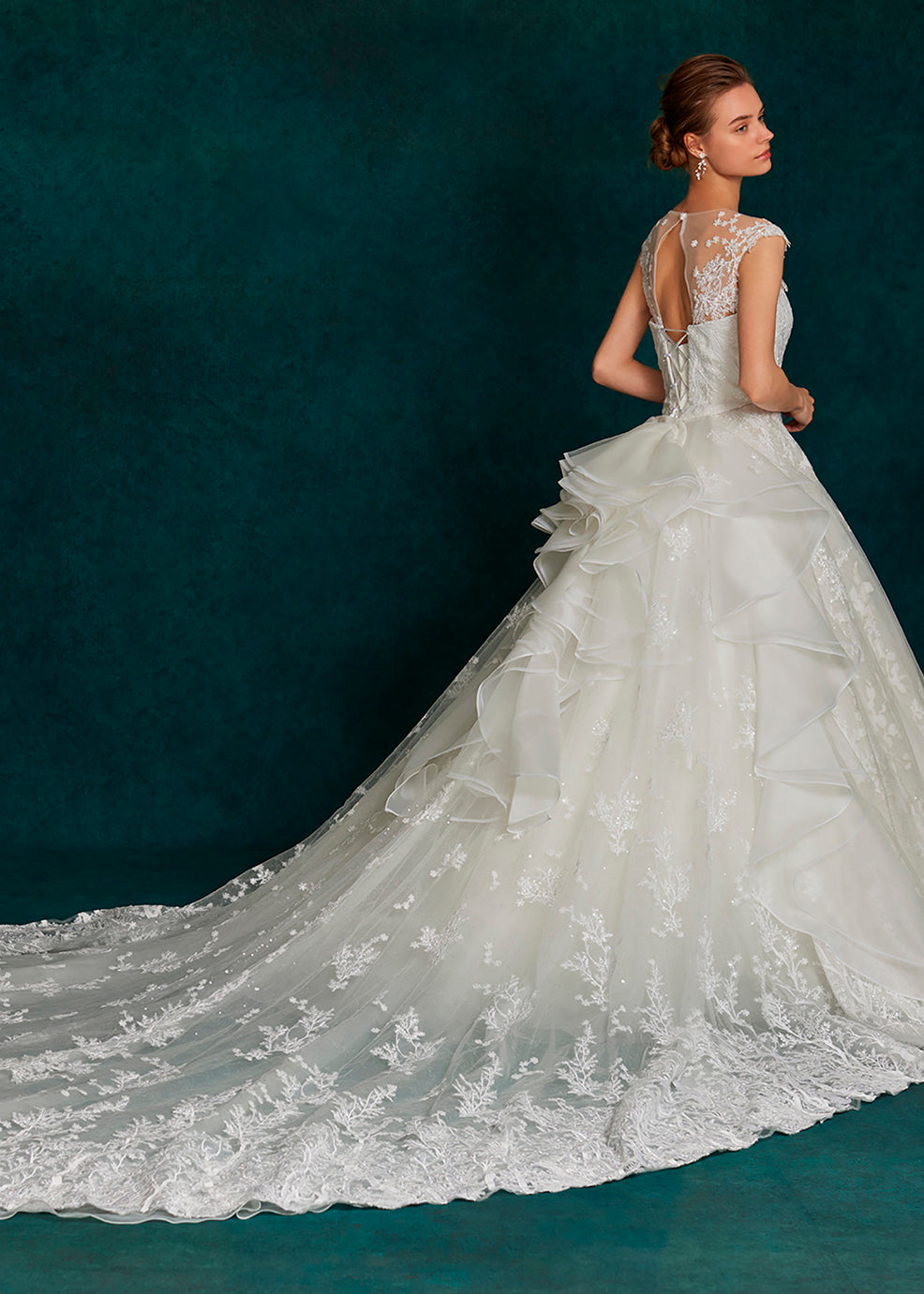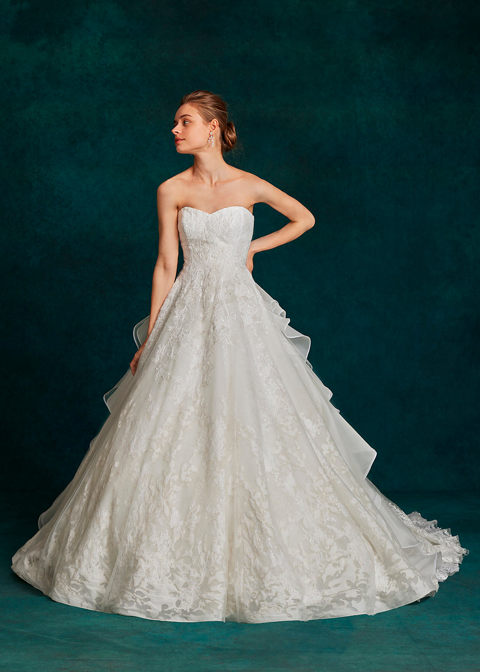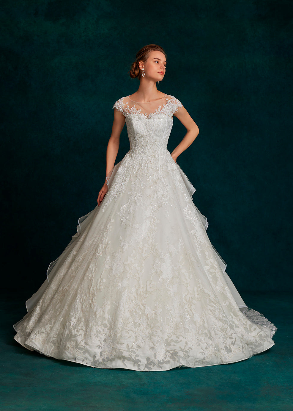 スターダストのようにキラキラと輝くスパンコールレースや、スカートから立ち上がるシフォンを加工した雪のようなレース。2つのレースを重ね合わせ、雪の結晶をイメージして作成したウェディングドレスです。