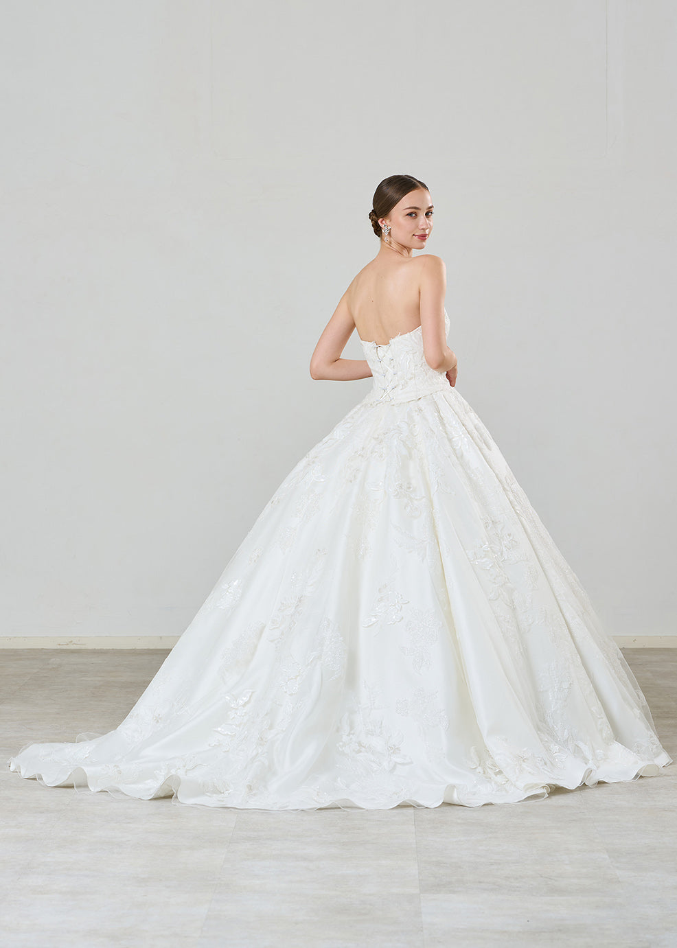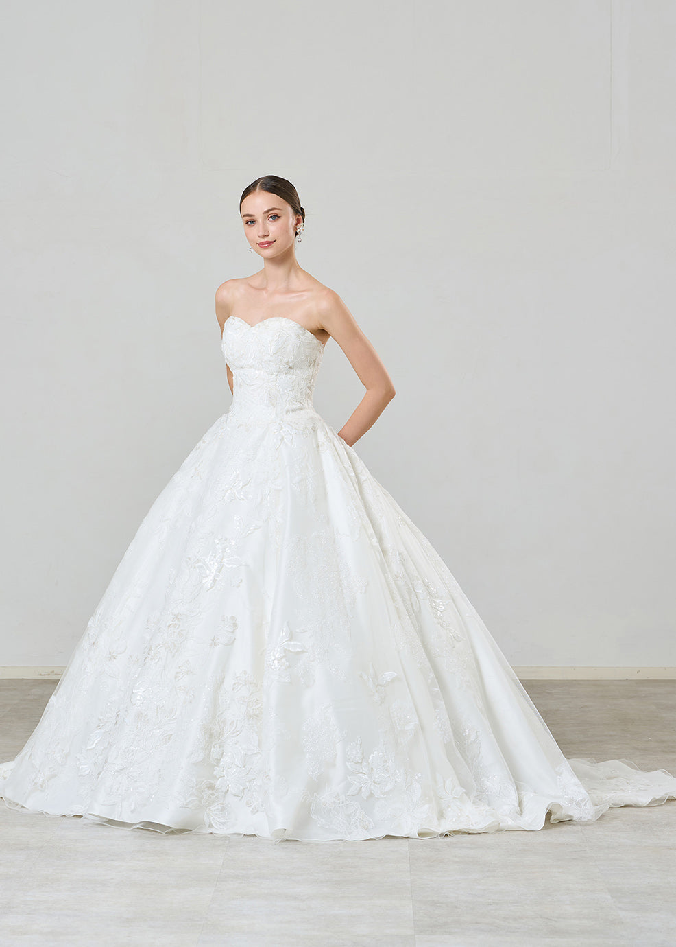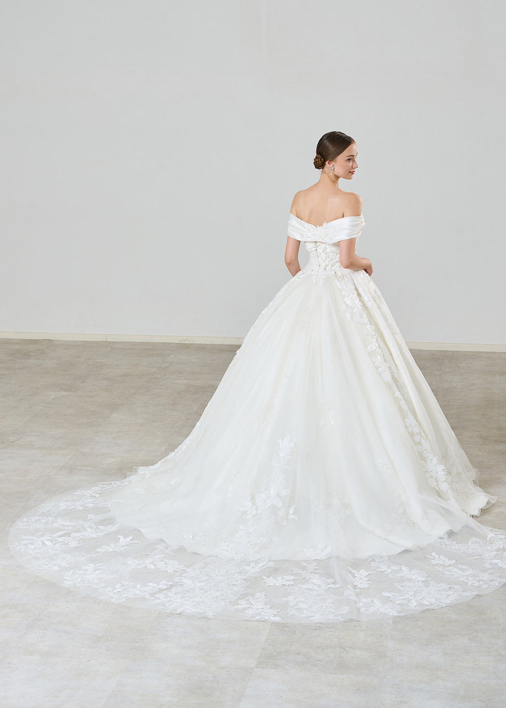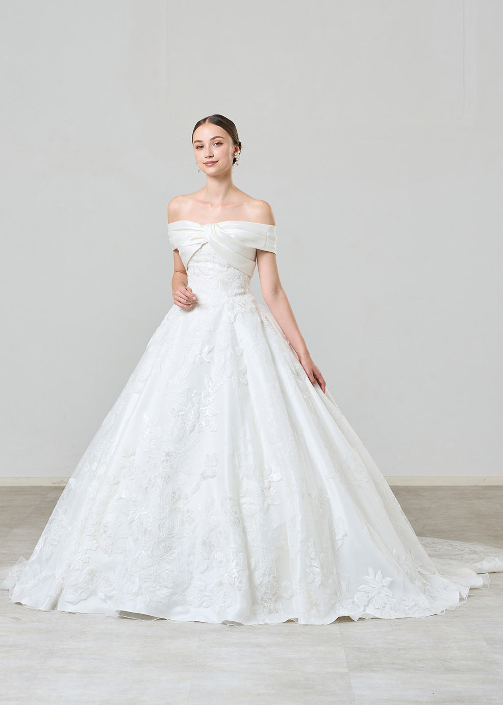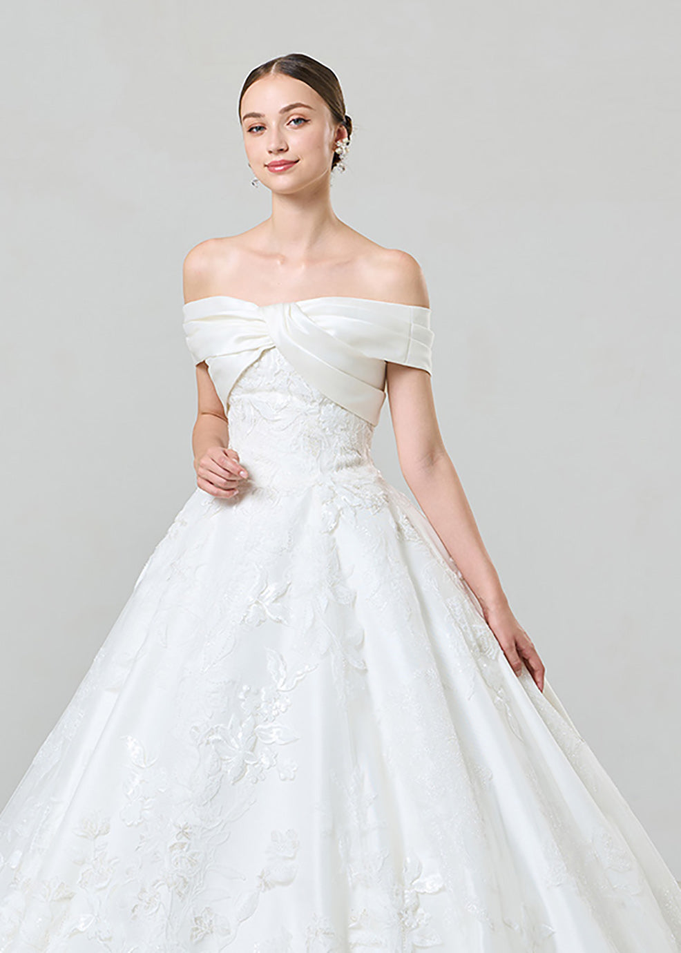 大柄のコードレースは写真でみても立体感があり印象に残ります。デザイン性のあるケープが王道なデザインをモダンなスタイルに仕上げます。ビスチェスタイルはシンプルでありながら柄レースの迫力感で存在感を与えます。