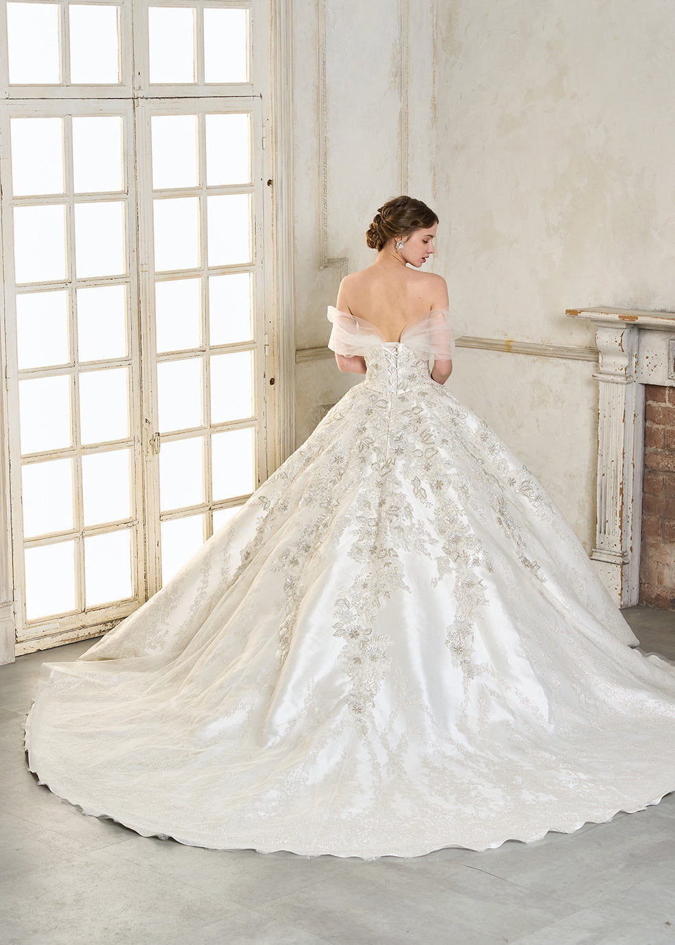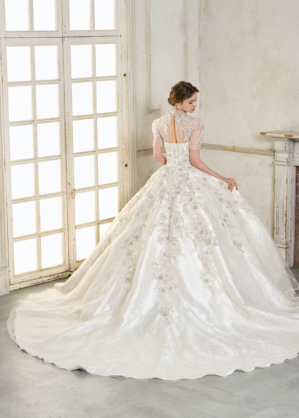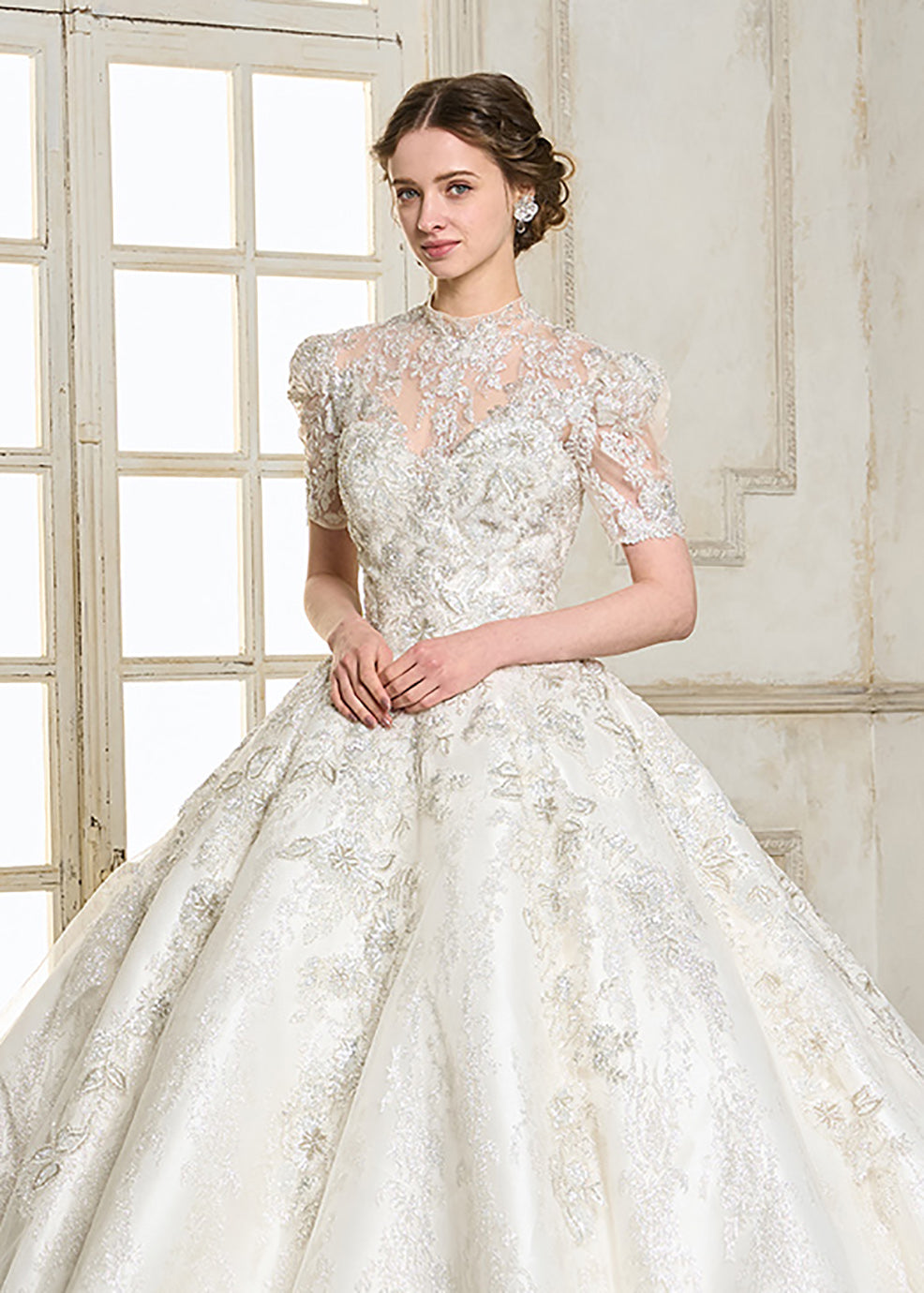 グリッターとビーズレースをふんだんに使用した韓国風ラグジュアリーstyle。パワーショルダーとふんわりチュールオフショルダーの2way仕様が嬉しいポイント。身頃からビーズレースが流れ、下からのグリッターで立ち上がる360℃豪華なプリンセスラインです。