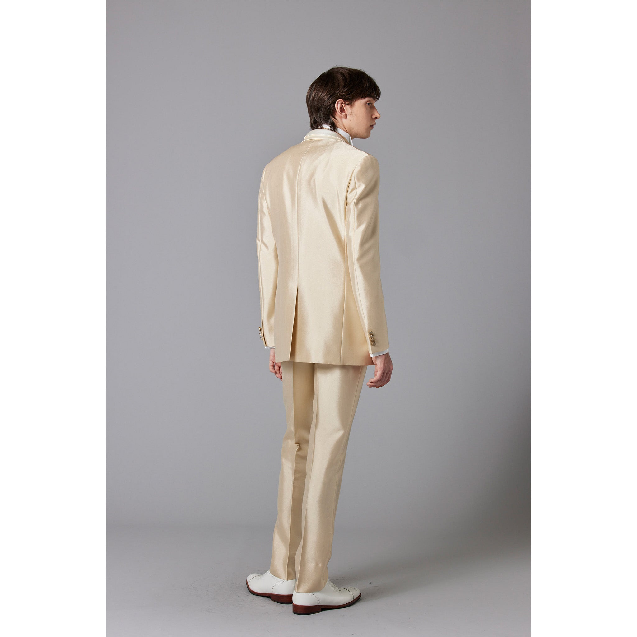 Champagne gold features a refined, gentle shine. It shines in various ways depending on the lighting in the venue. When combined with ivory and white satin, it creates a unique transparency, creating a refreshing look. This stylish tuxedo is designed with attention to detail, such as the double collar.