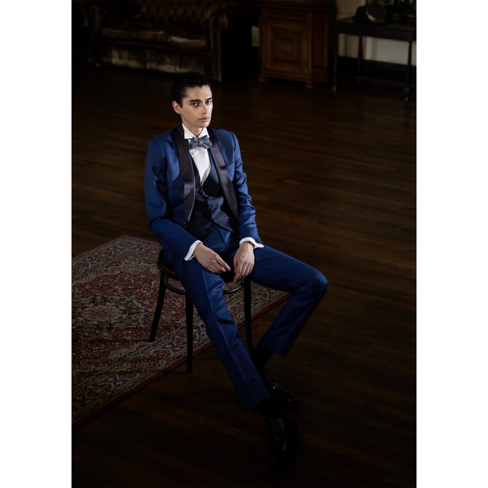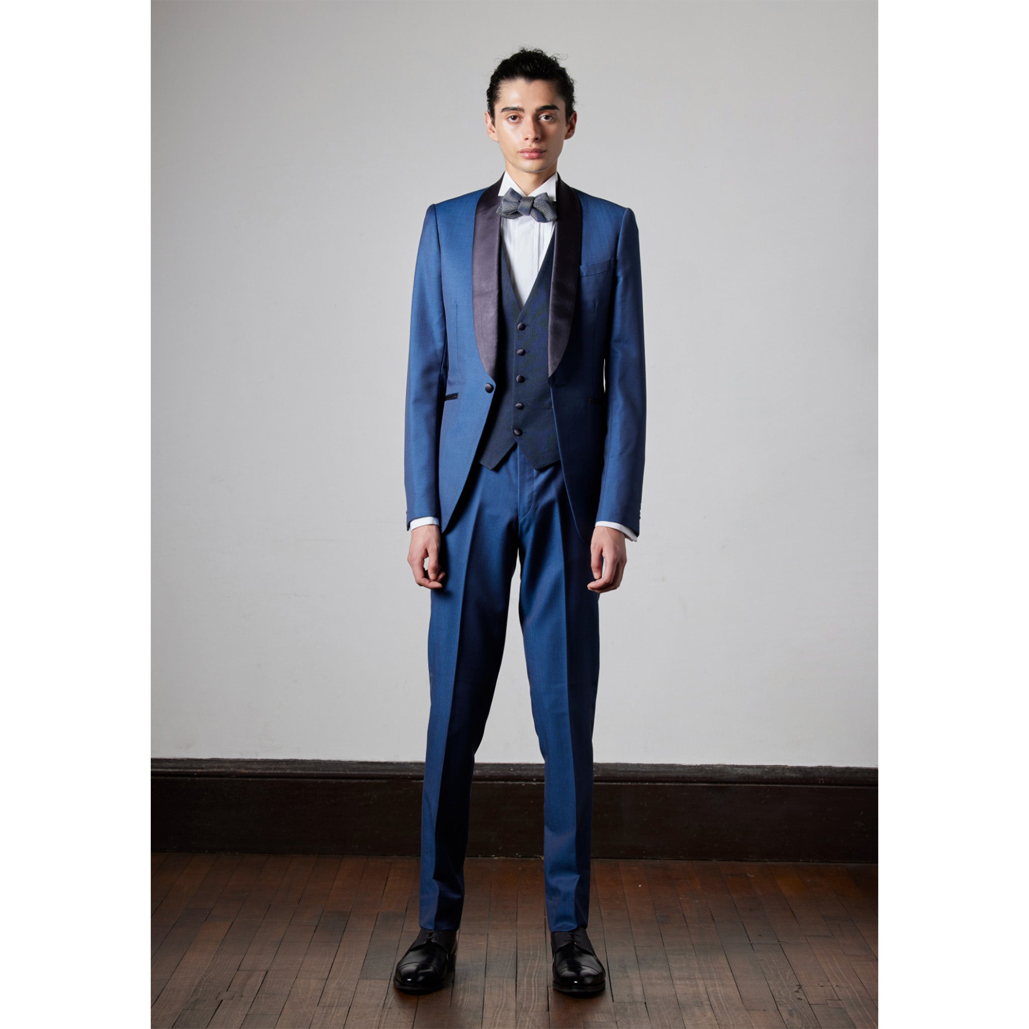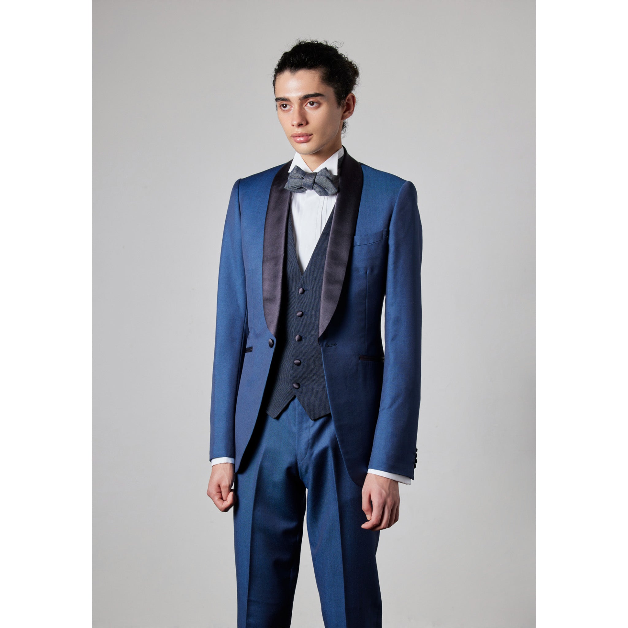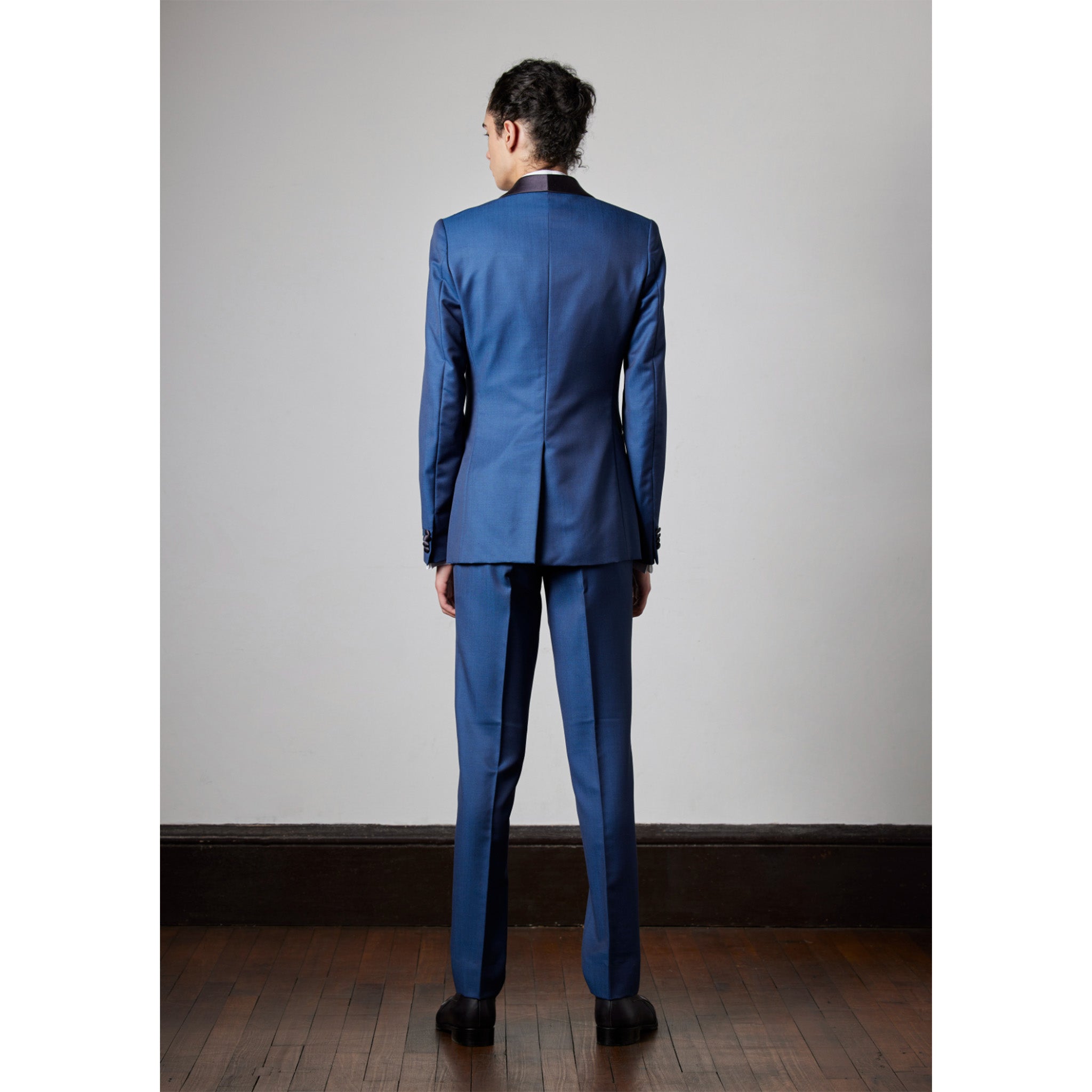 This is the most sophisticated suit available today, made with Dormeuil's superior materials and tailored into a stylish silhouette. This tuxedo features a beautiful, elegant styling in royal sax and navy blue, giving the wearer confidence and dignity.