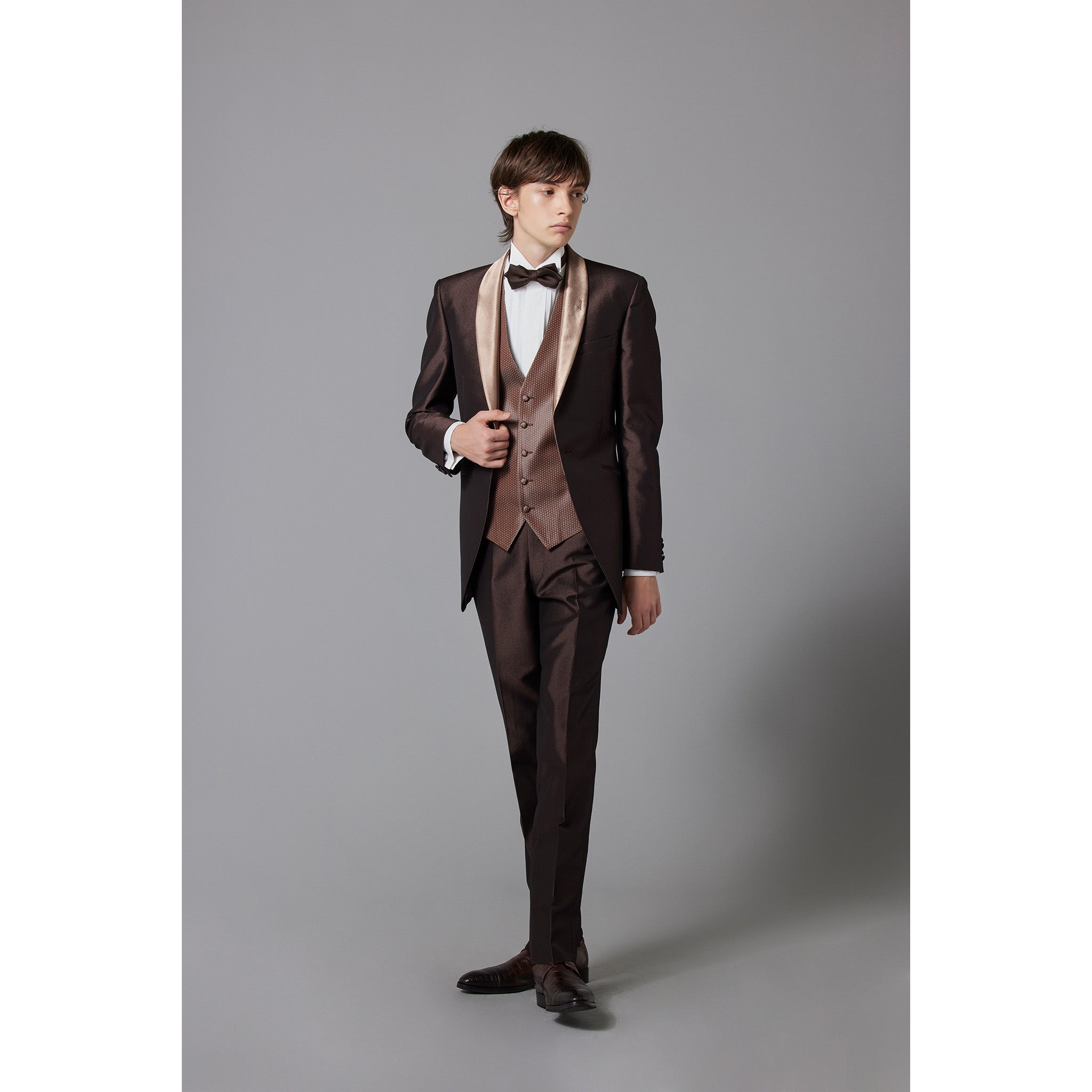 A simple brown shawl collar tuxedo. The light brown satin combined with the calm brown creates a soft and gentle atmosphere. Add a polka dot vest and bow tie to this elegant set-up to add a touch of cuteness. This tuxedo can be used in a wide range of situations.