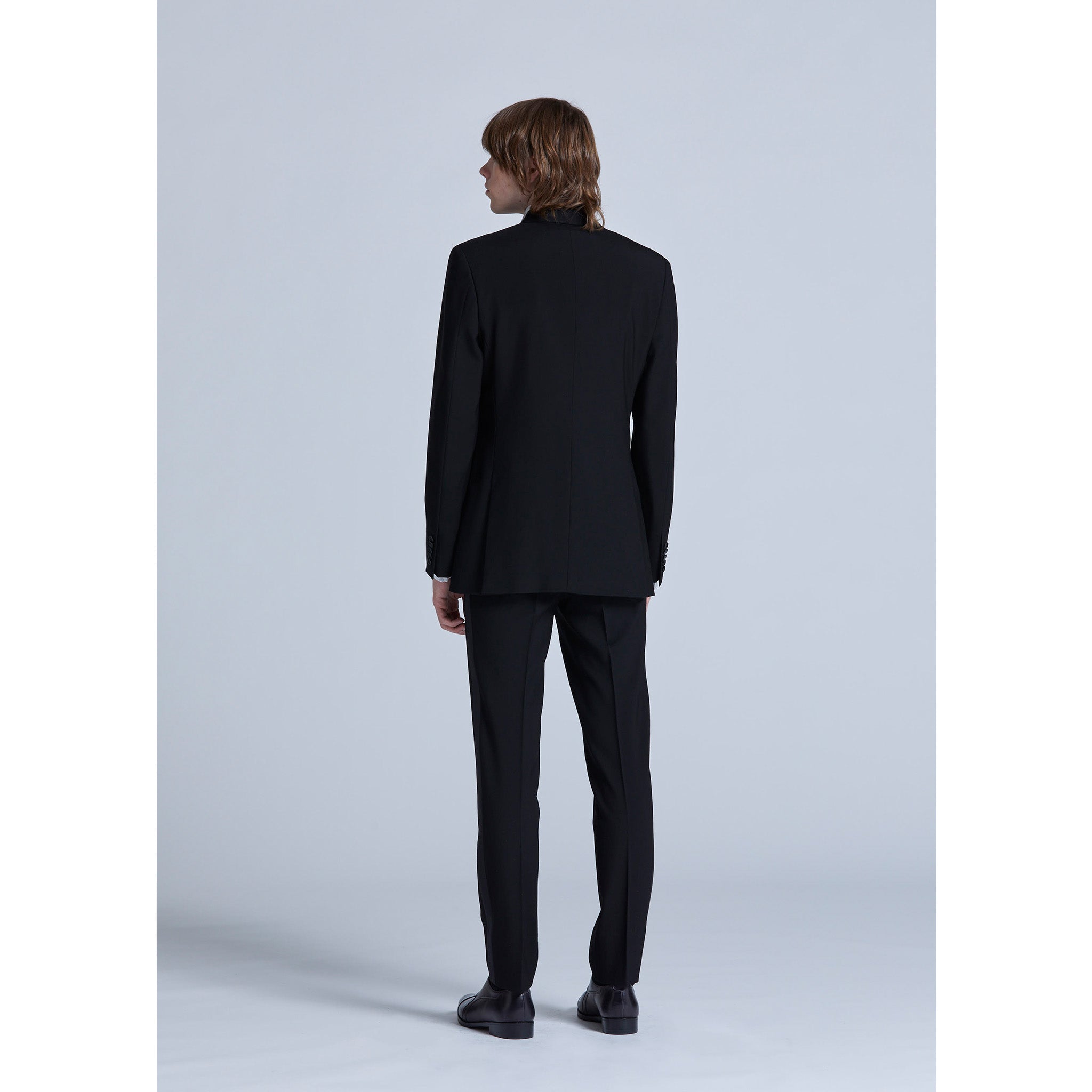 A double-breasted tuxedo with two pairs of pants, one in the same material and one in tartan check. By changing the pants, you can enjoy it in various ways depending on the scene. The front hem and lapel of the jacket are rounded, and the side stripes of the pants are slightly thick. It is a stylish setup with attention to detail.