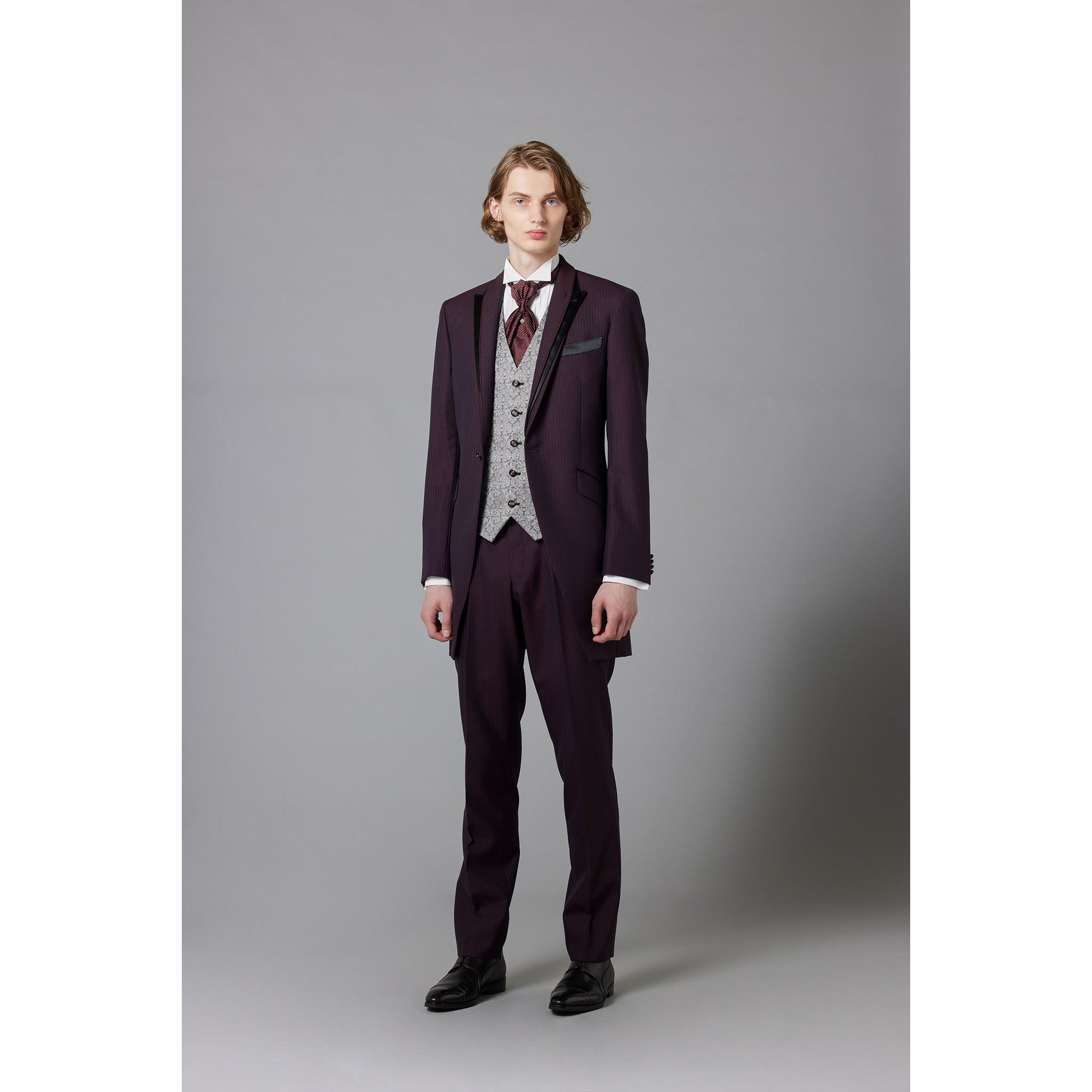 The wine-colored tie and classic patterned vest create an elegant look. It also has a dignified masculinity and goes well with adult colored dresses, making it a perfect match for a hotel wedding.