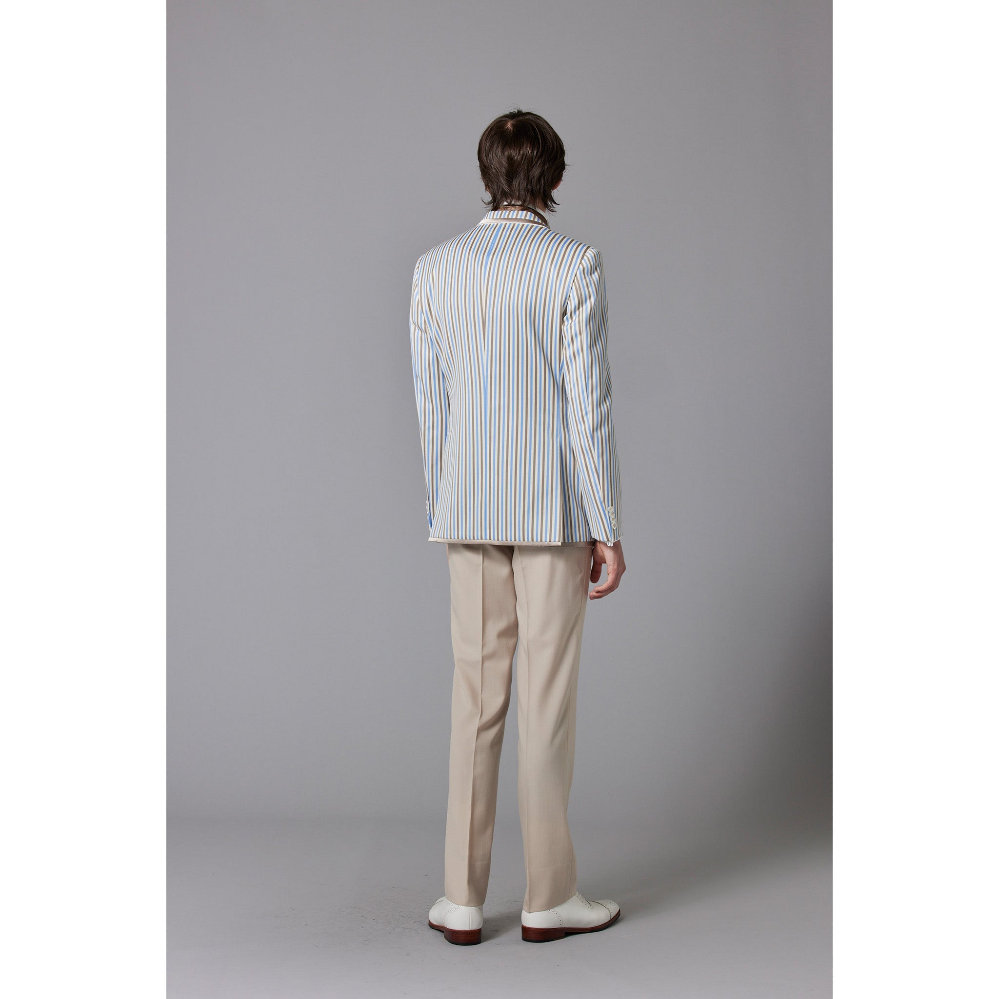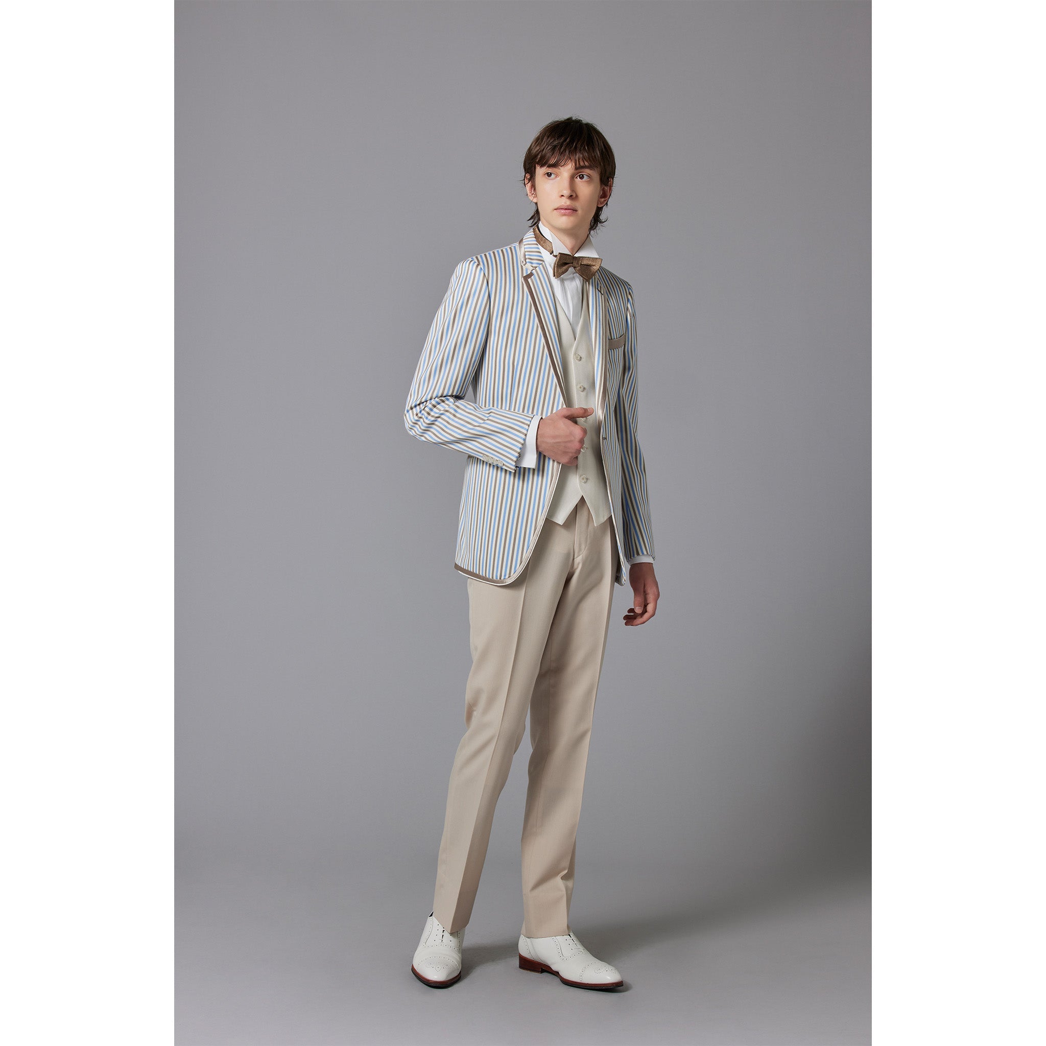 A refreshing tuxedo featuring vibrant blue and beige stripes.