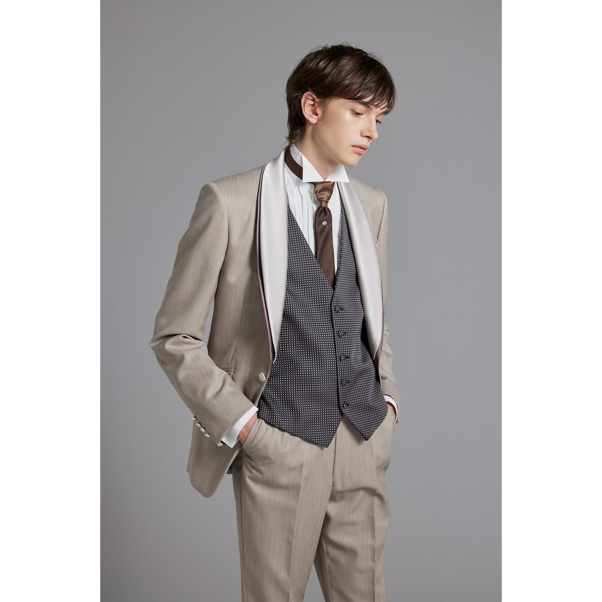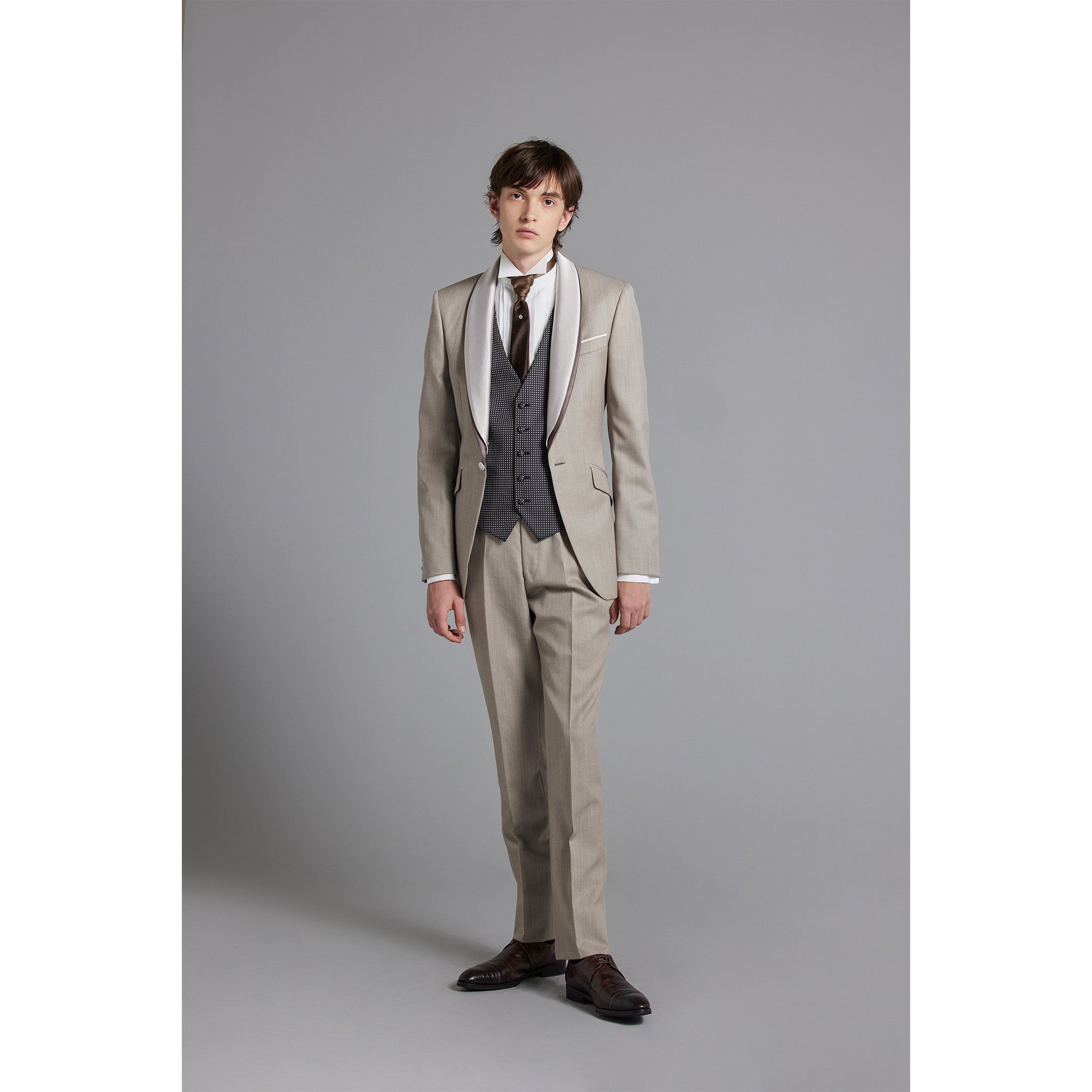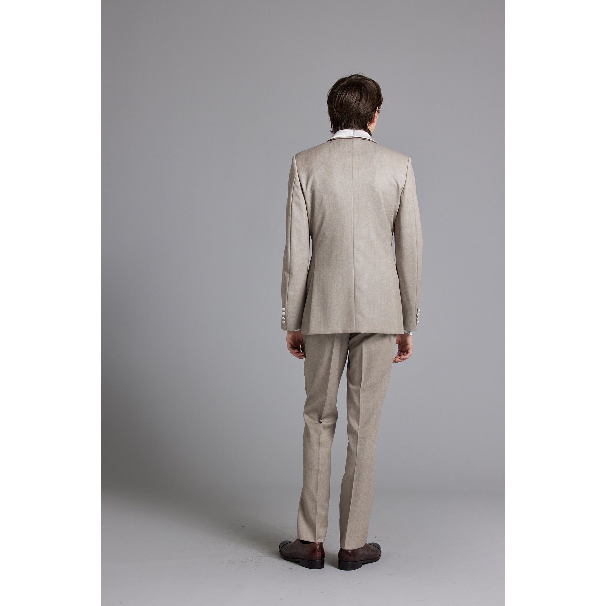 "Tuscany Mocha Beige" is a nuanced color made by interweaving brown and beige threads using beautifully lustrous wool Tuscan yarn. This tuxedo has an excellent color that exudes elegance and intelligence. The jacket is made with a focus on authentic tailoring, and the fabric itself is soft and natural, making it very light to wear and giving it a smart appearance, creating a modern silhouette unique to Hardy Amies. The shawl collar of the jacket is made of two layers of exquisitely shaded colors, giving it a luxurious feel unlike any other and going well with imported dresses. This is a one-of-a-kind tuxedo that has an overwhelming presence that is unmatched despite its light color.