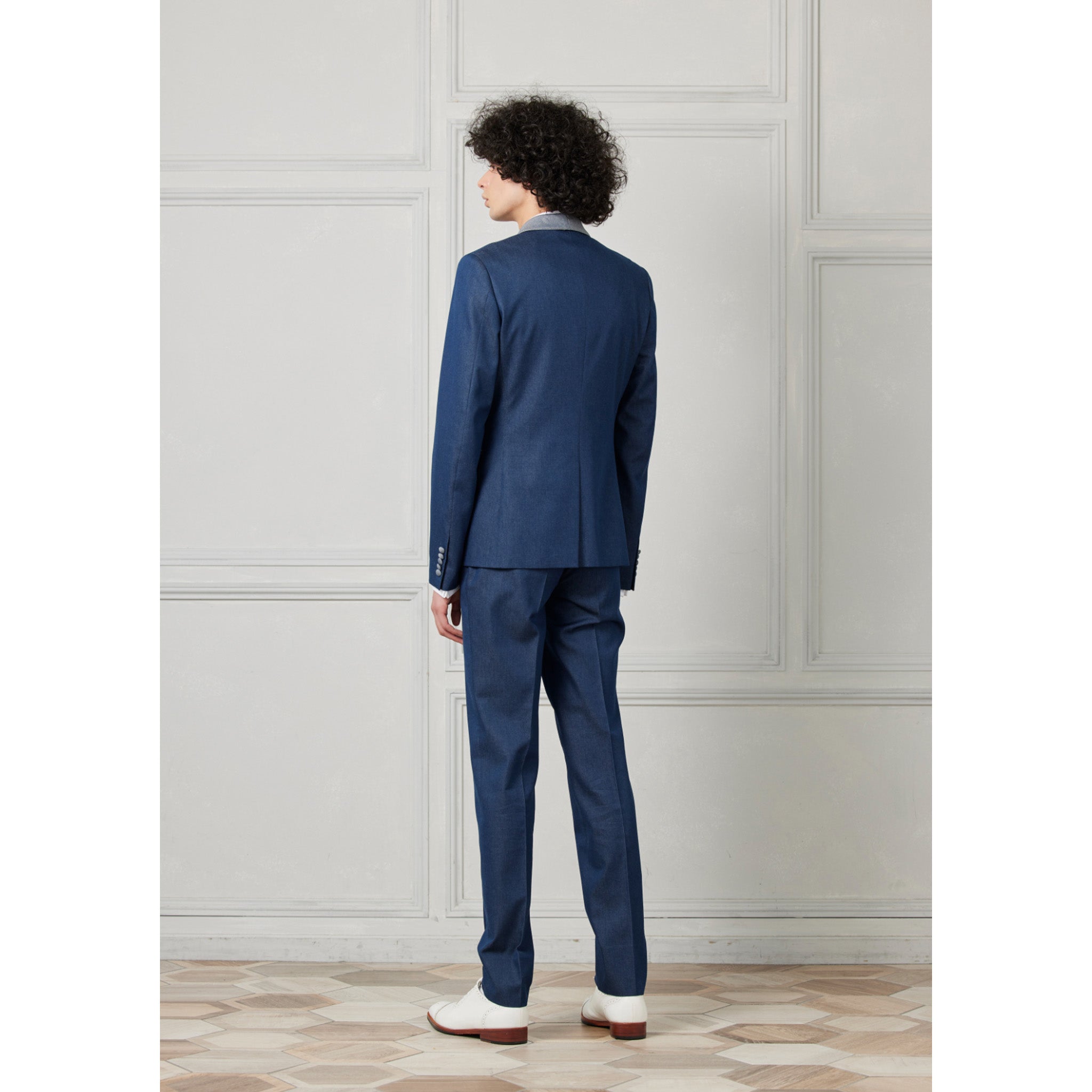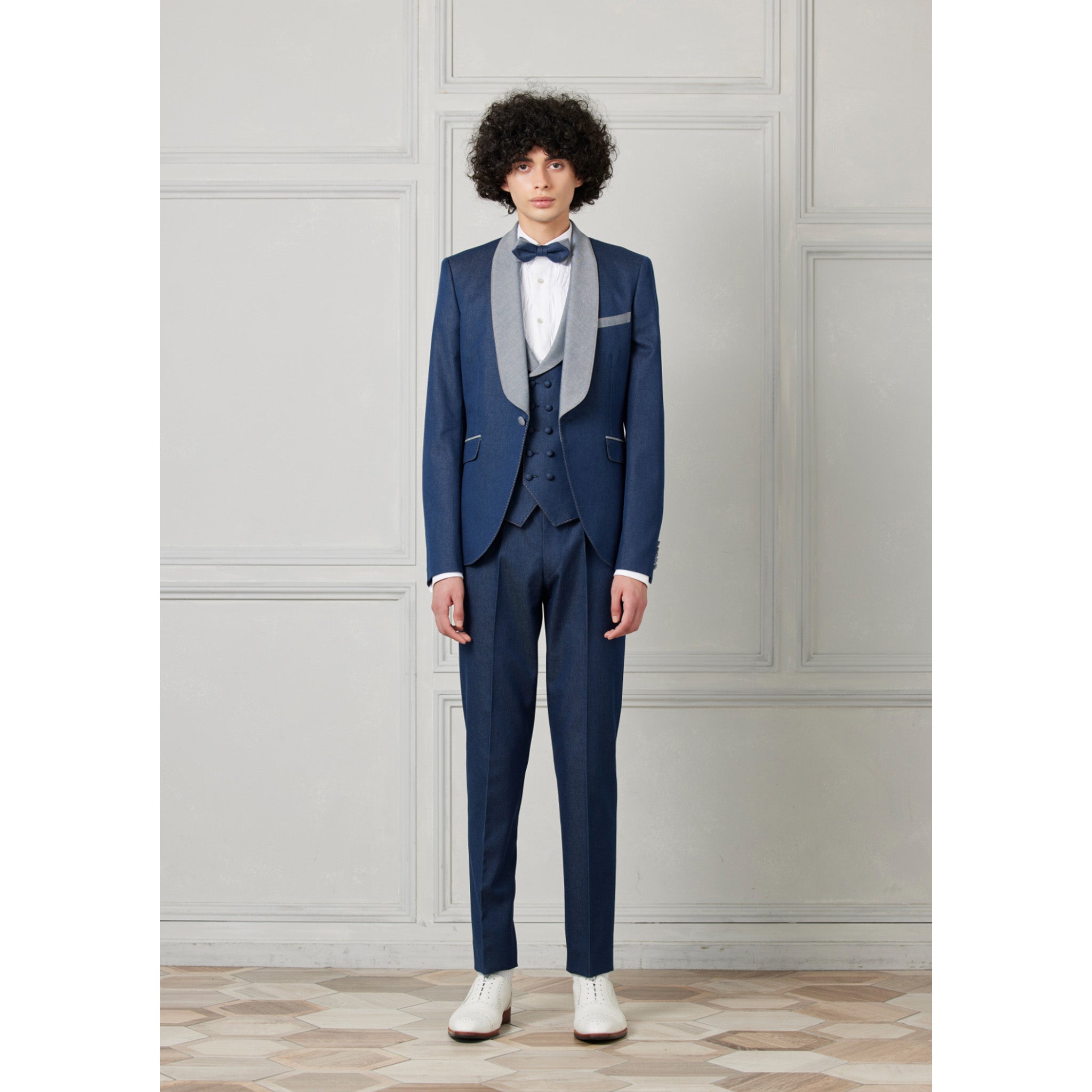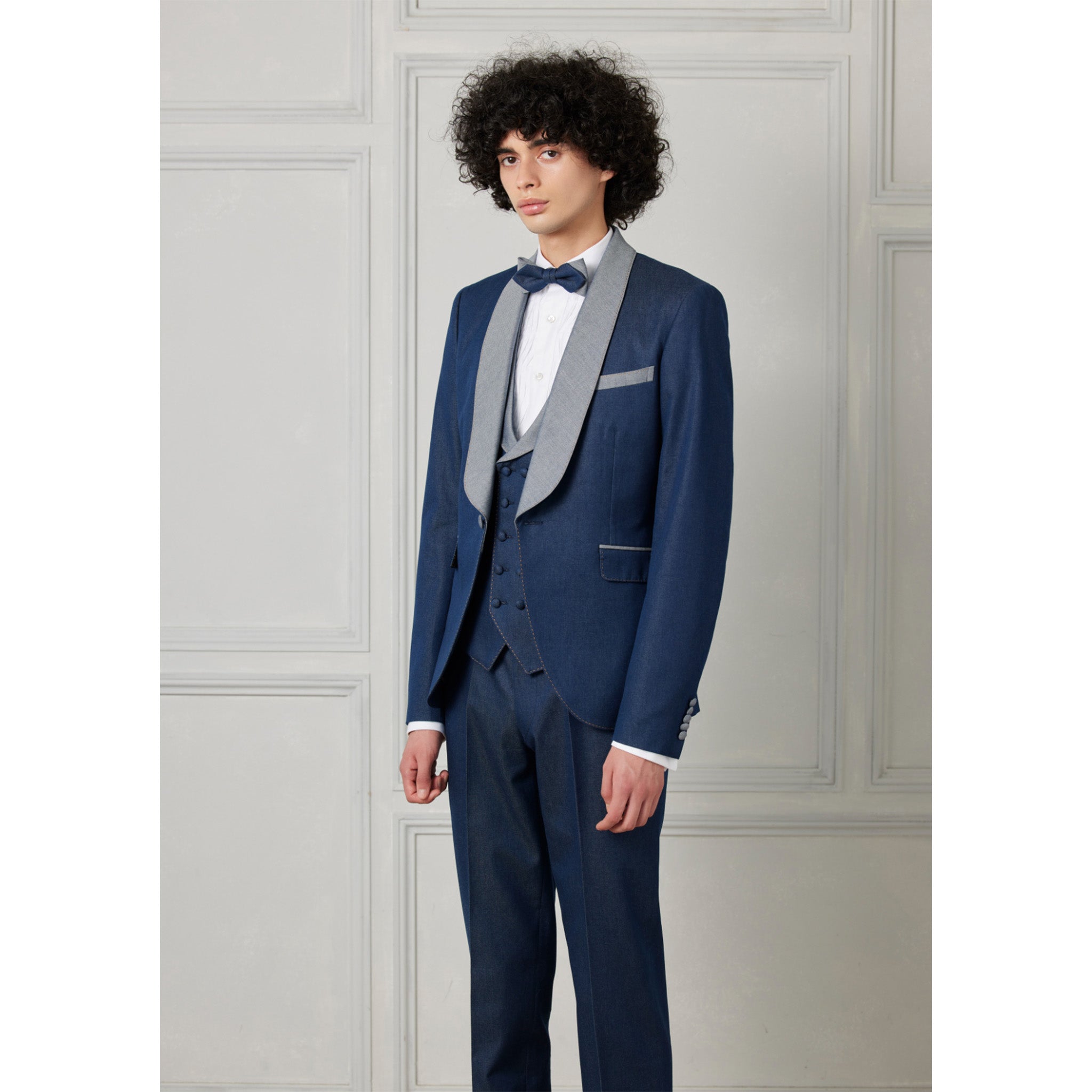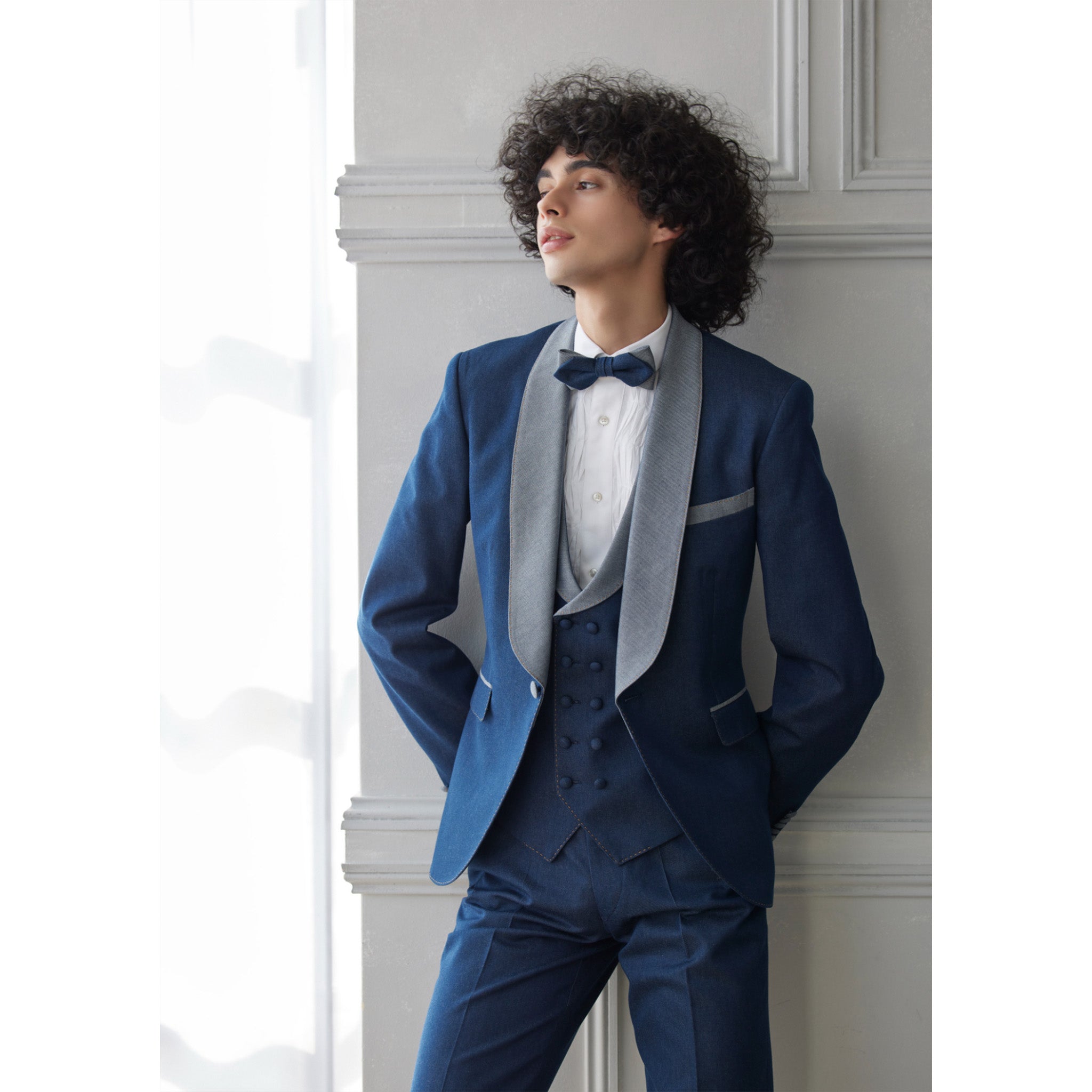 A unique and creative tuxedo styled in a soft blue all-denim look. Pay attention to the playful tailoring throughout, such as the shallow double-breasted vest, stitching, and the lapels that look like they've been rolled up to show off a different denim look.