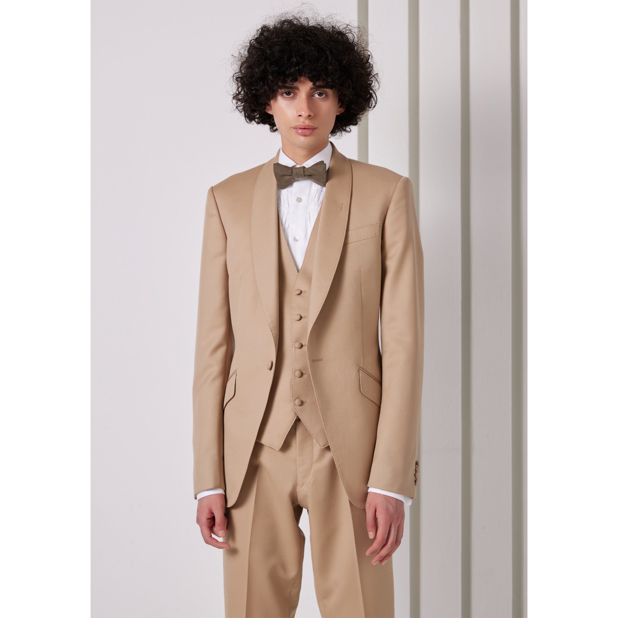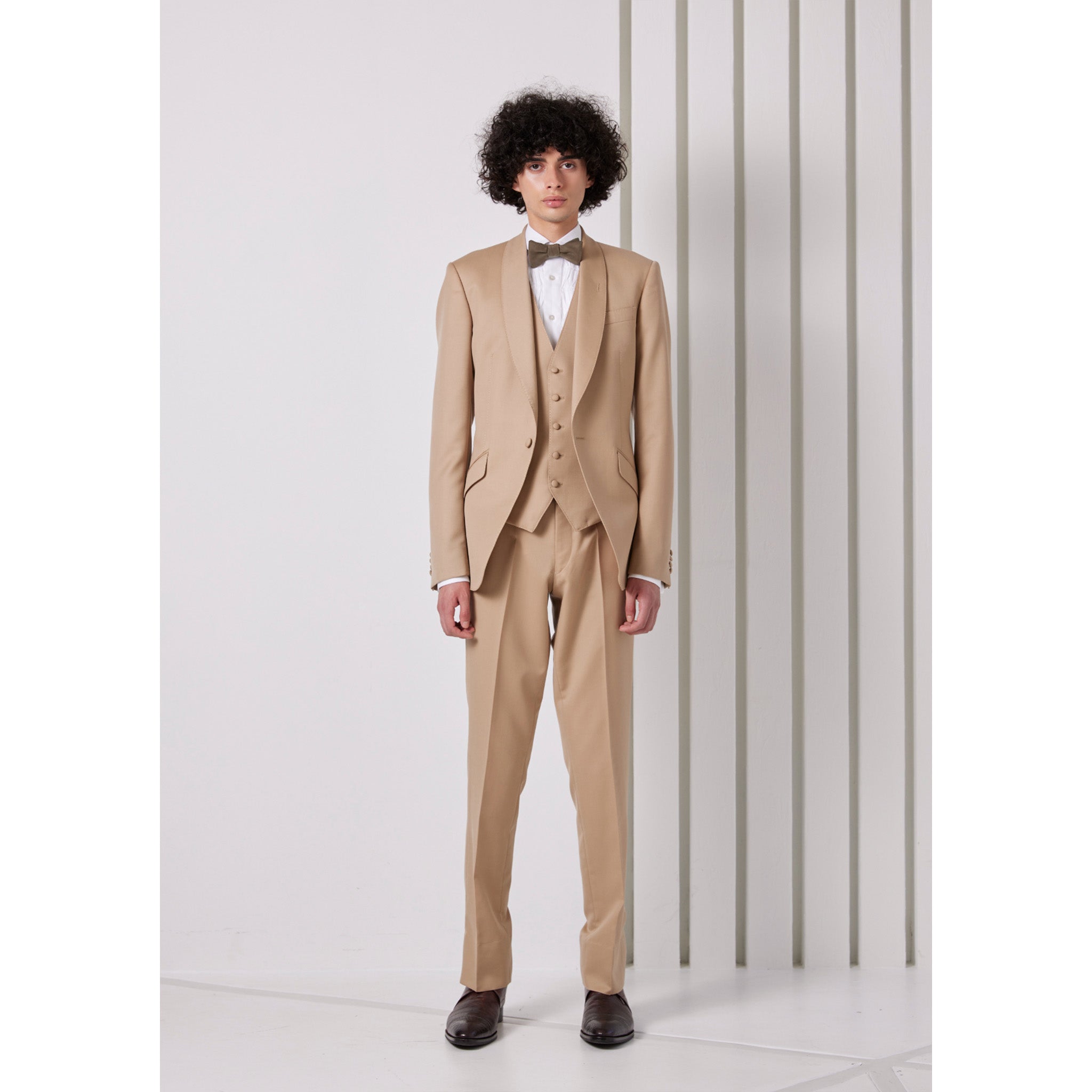 The minimalist design, all in chino beige, and simple styling are perfect for a modern, sophisticated groom.