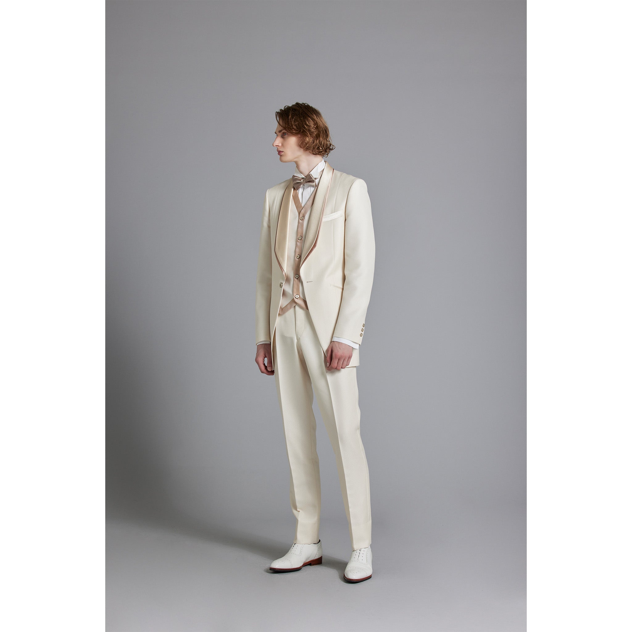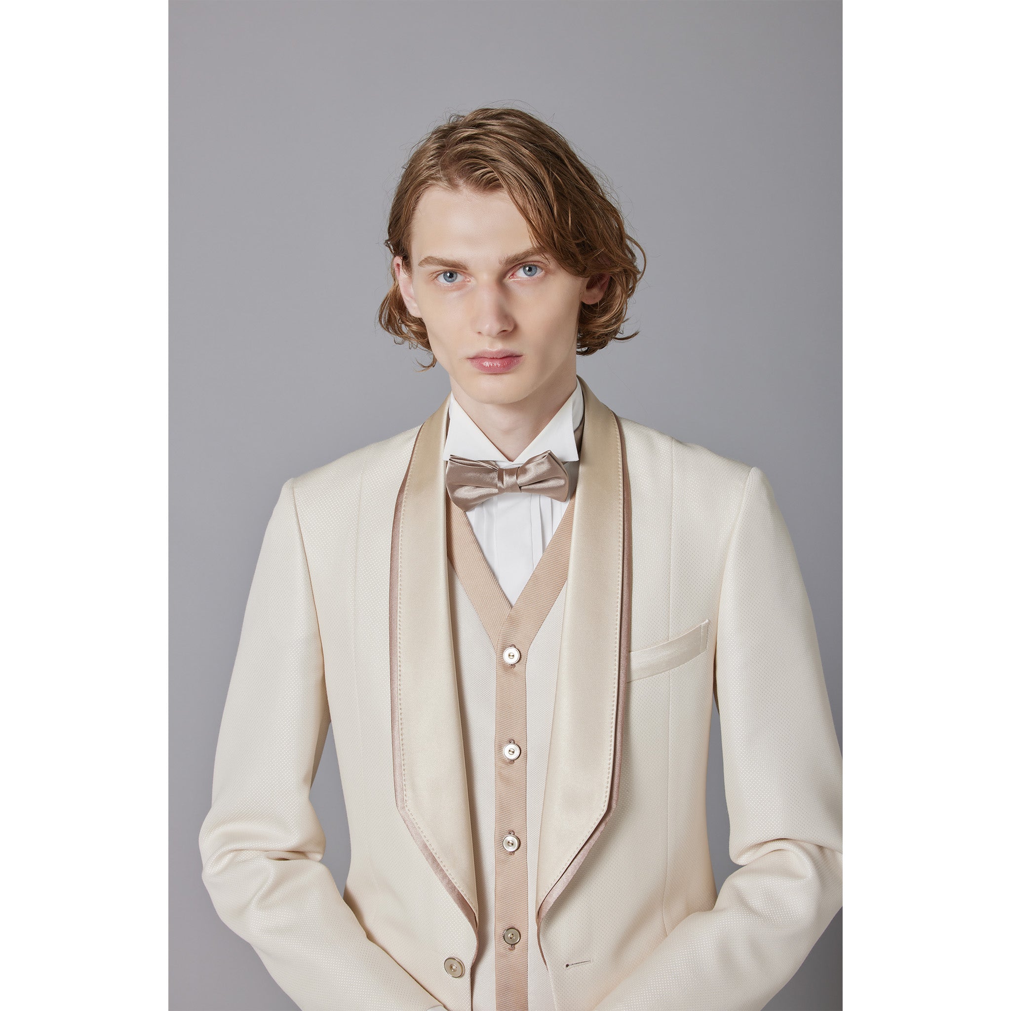 This tuxedo has a blend of champagne colors that exude an elegant charm.