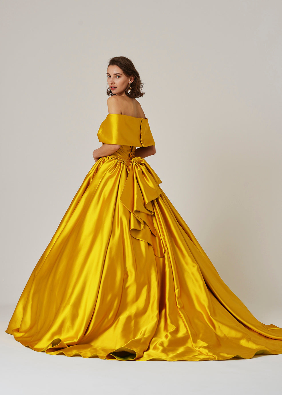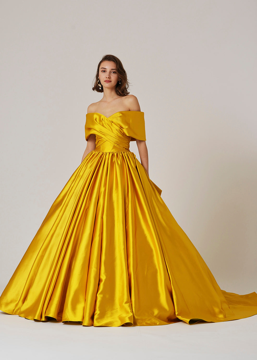 A simple yet striking dress made from an abundance of elegant, shiny Refino satin. The cape on the chest is designed to be crossed to make the décolleté line look beautiful.