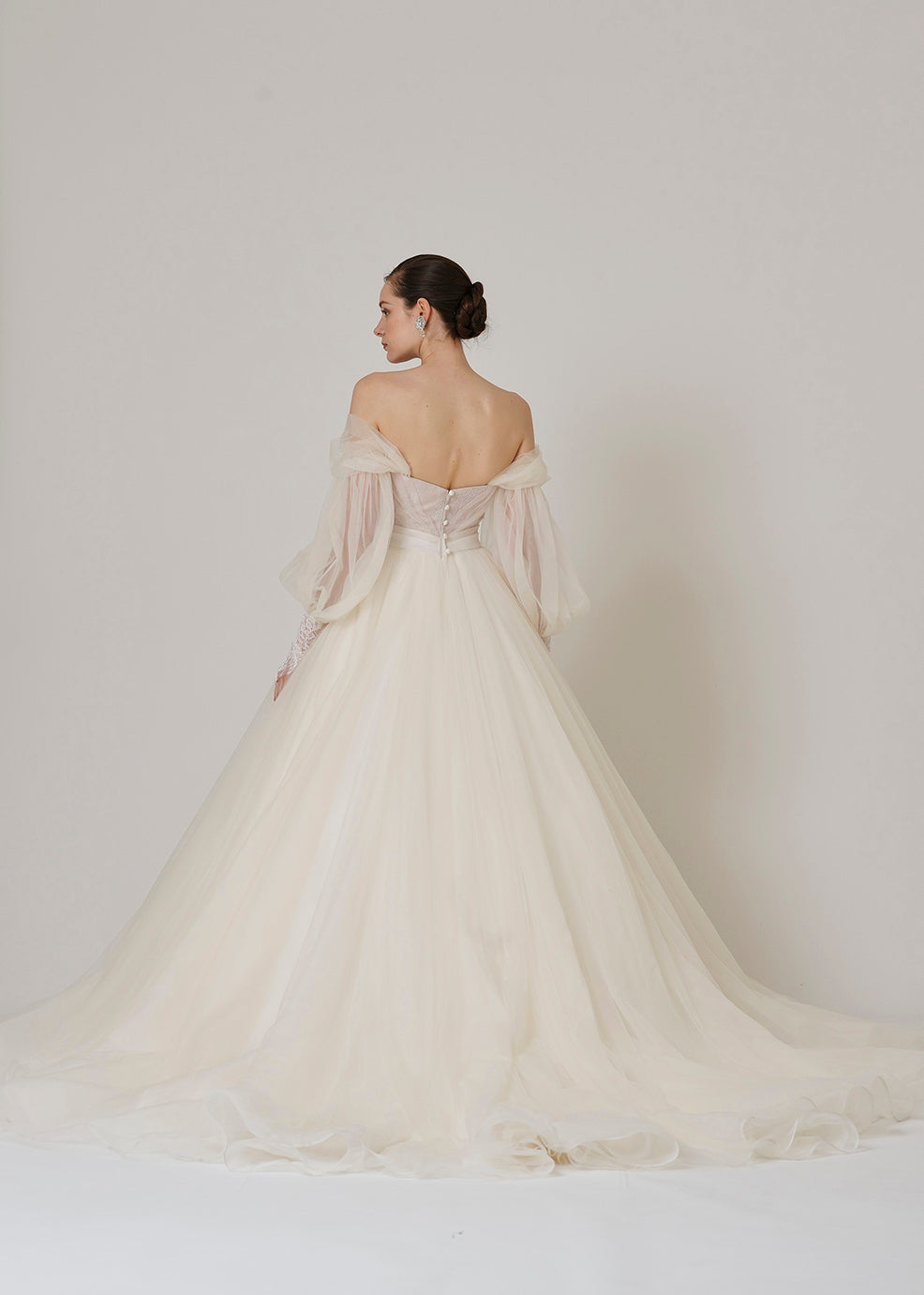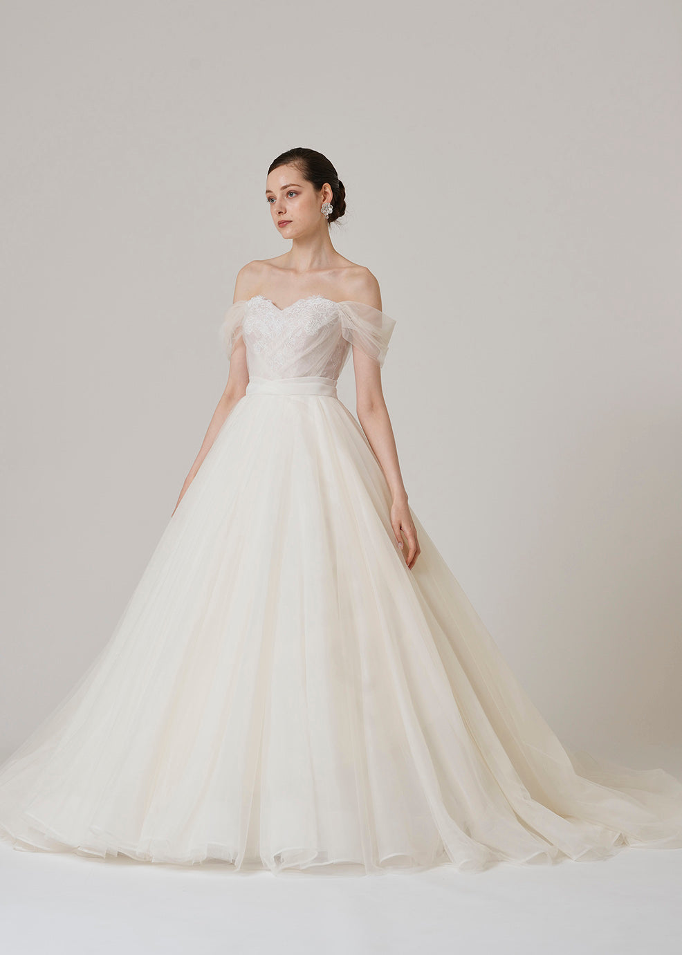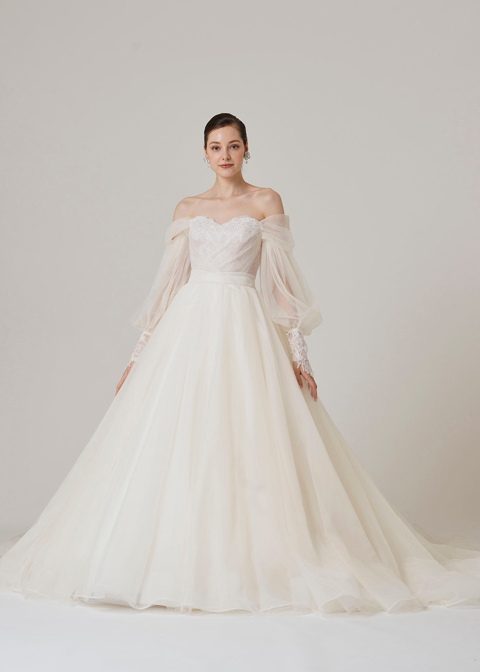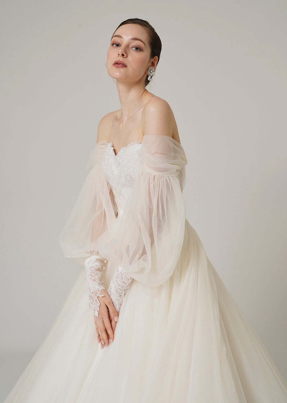 오프숄더의 퍼프 슬리브가 인상적인 1벌.길은 코드 리버 레이스와 샹테리 레이스를 조합한 섬세한 디테일이 되어 있습니다. 퍼프 슬리브를 제거하면 오프 숄더 스타일로 변경됩니다.