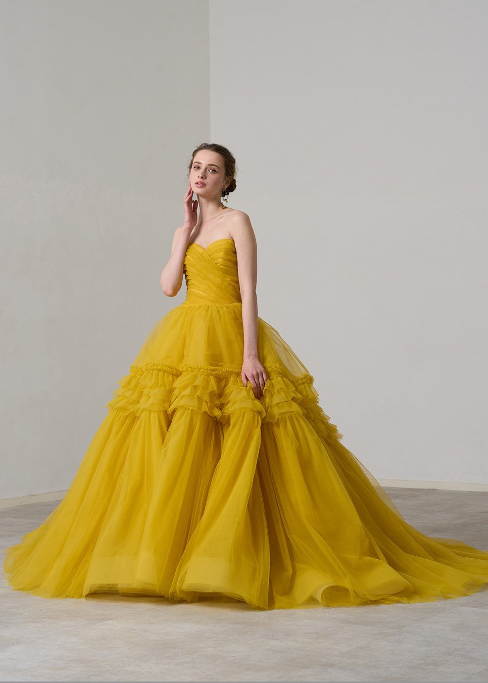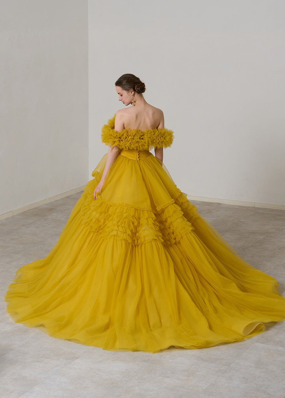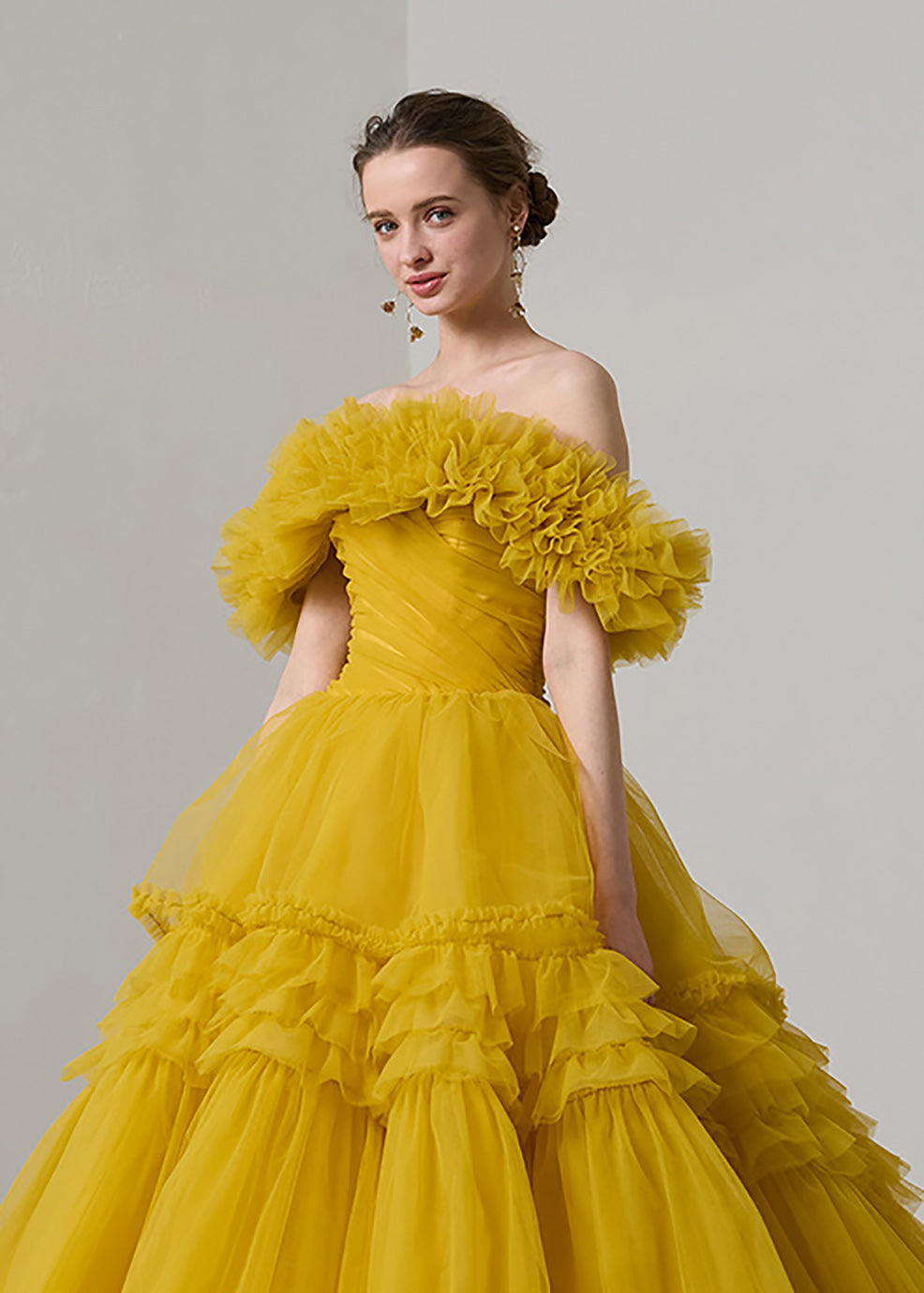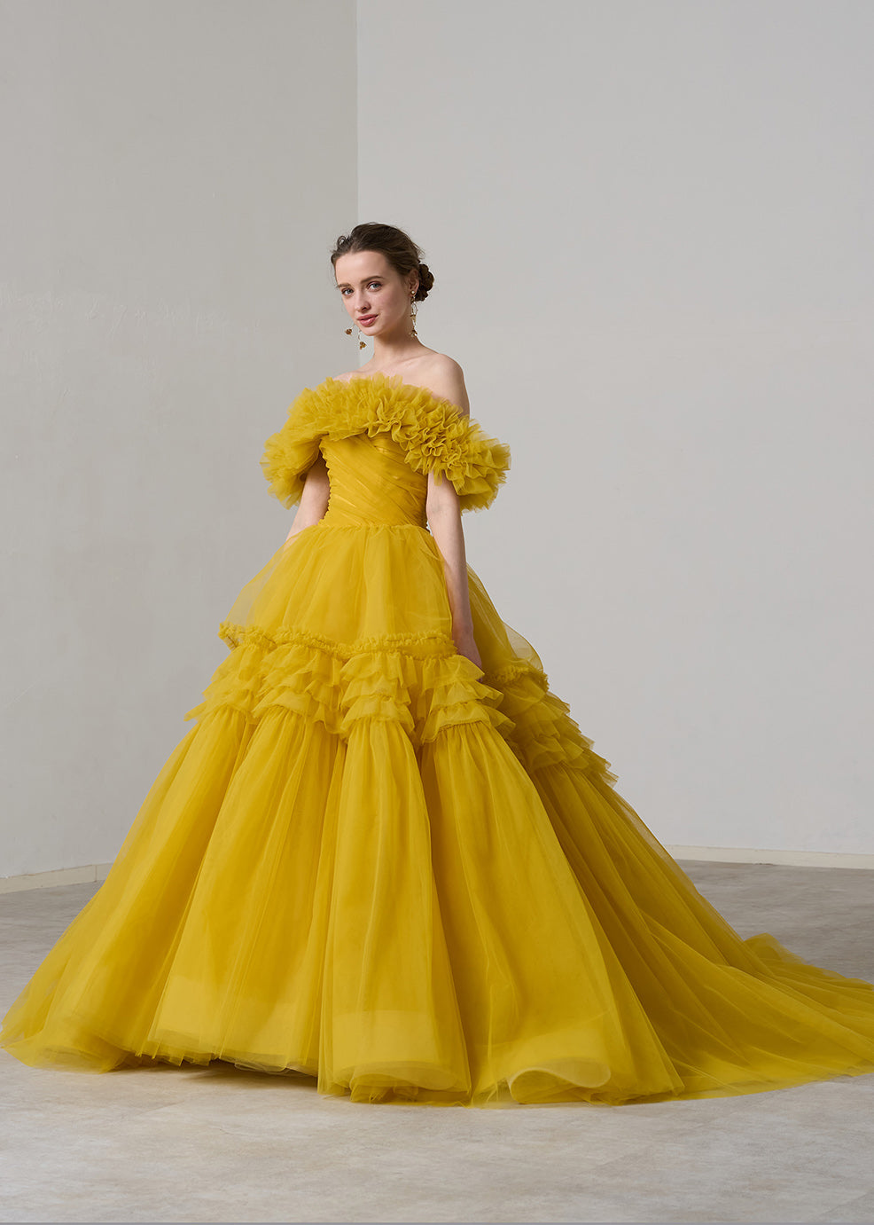 박력의 BIG 플레어 스커트에 프릴 가공을 한 임팩트가 있는 1벌.스커트 볼륨을 억제해 플레어감을 강조하는 것으로, 장식적이면서도 너무 귀엽지 않고, 모던한 인상이 되도록 완성했습니다 프릴의 오프숄더는 탈착식으로, 인상이 갈라리로 변화합니다.