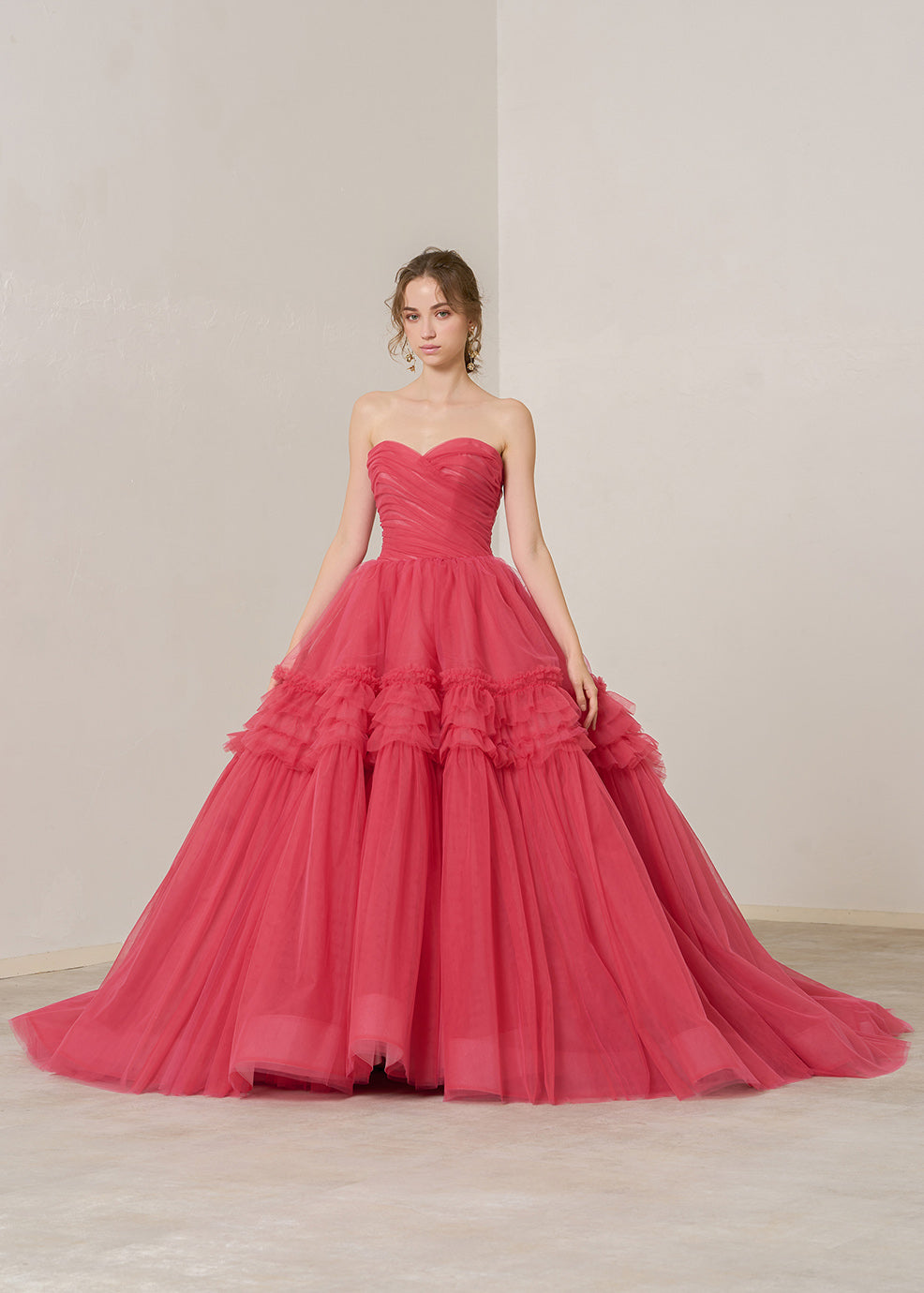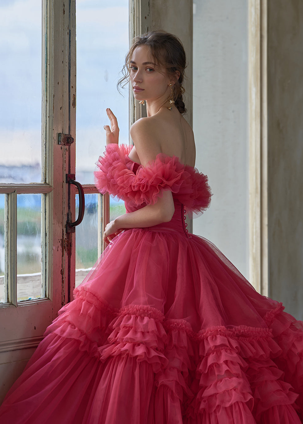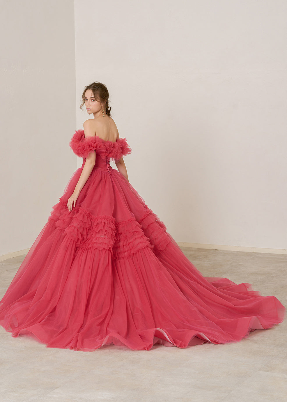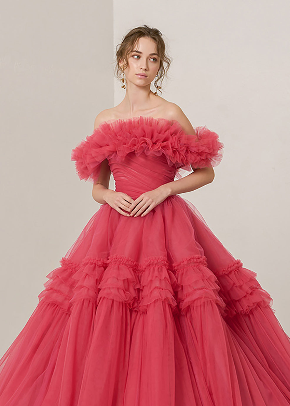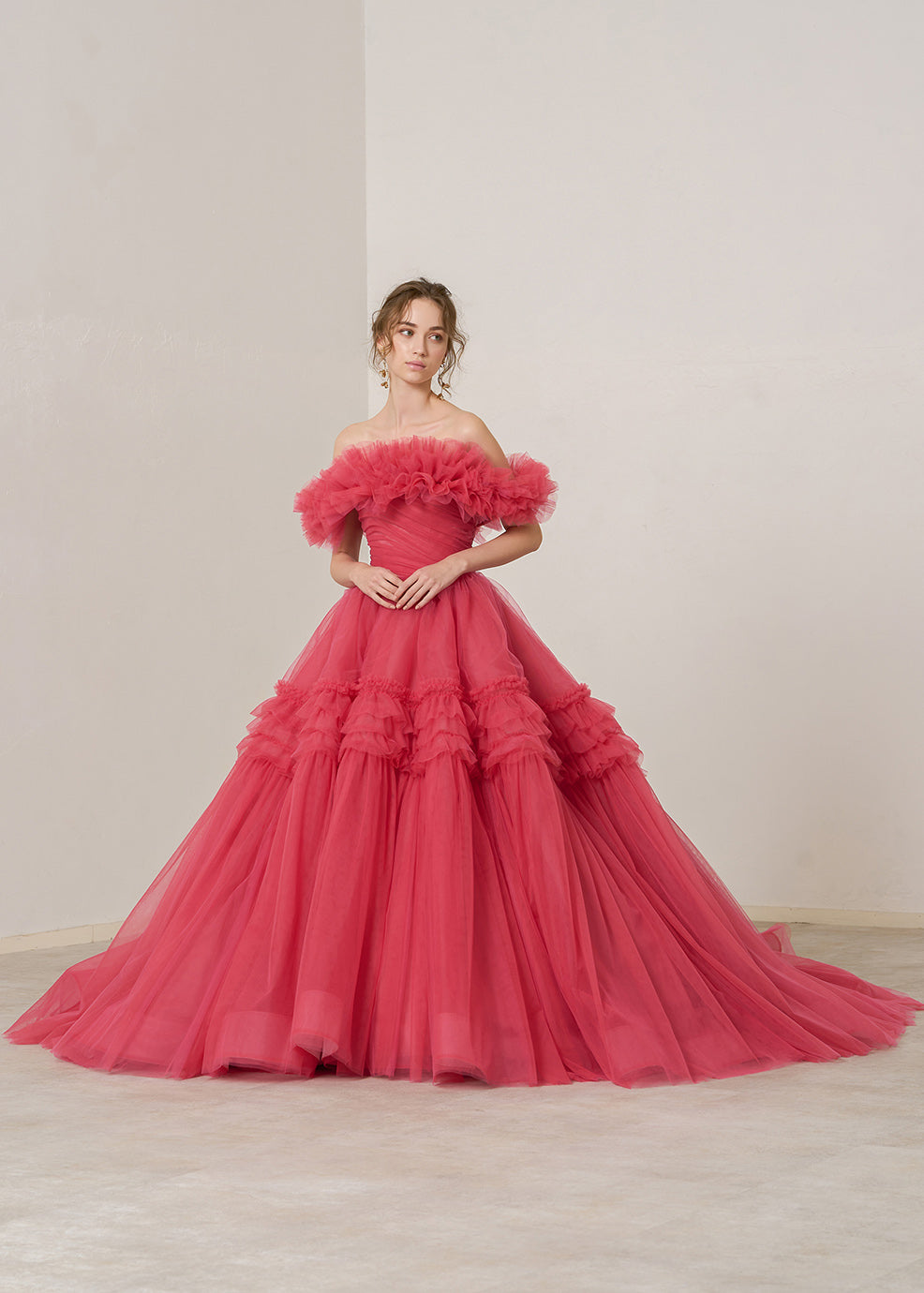 박력의 BIG 플레어 스커트에 프릴 가공을 한 임팩트가 있는 1벌.스커트 볼륨을 억제해 플레어감을 강조하는 것으로, 장식적이면서도 너무 귀엽지 않고, 모던한 인상이 되도록 완성했습니다 프릴의 오프숄더는 탈착식으로, 인상이 갈라리로 변화합니다.