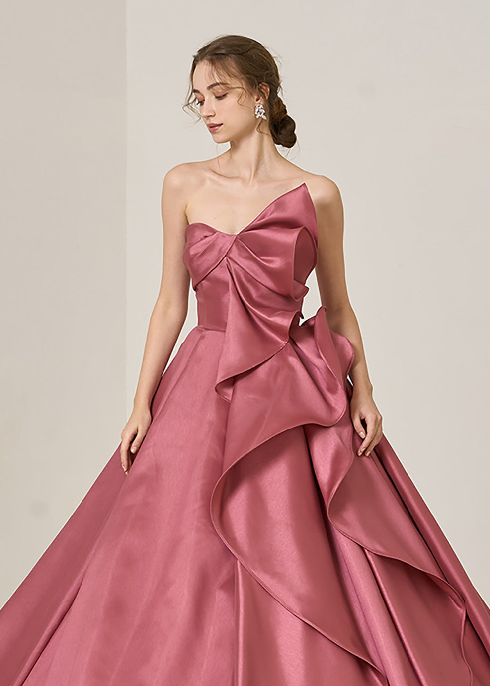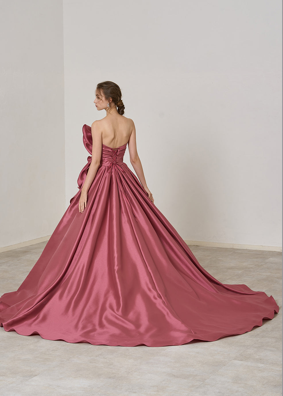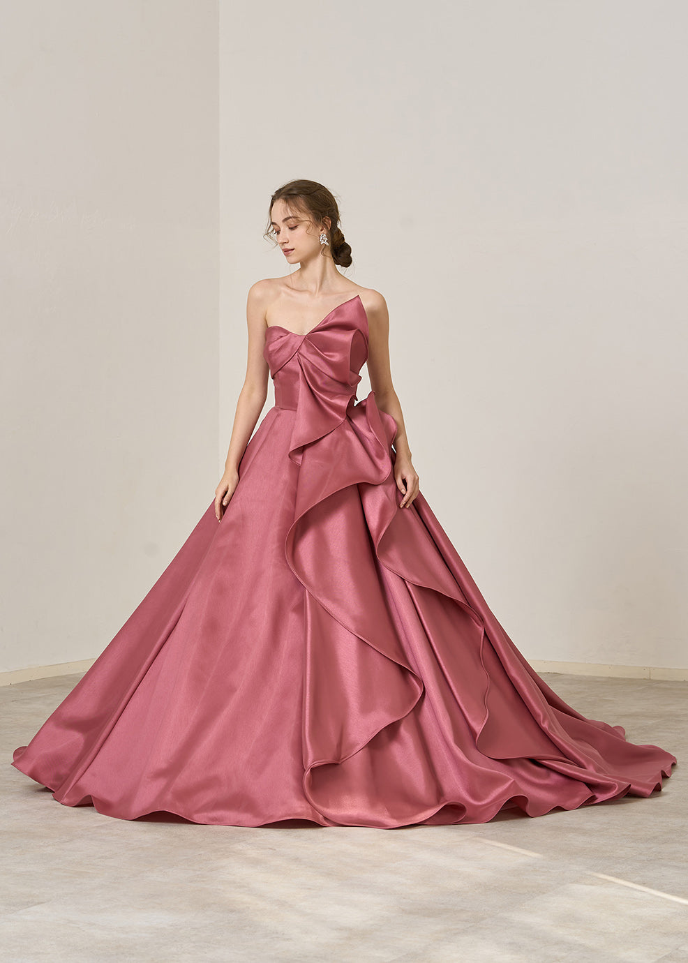 입체적인 흉원 리본으로부터 스커트 프릴에 연결하는 쿠튀르적인 귀여움을 표현.오른쪽으로부터 백에 걸쳐서는 ​​심플하게 완성하는 것으로, 깔끔한 인상에.