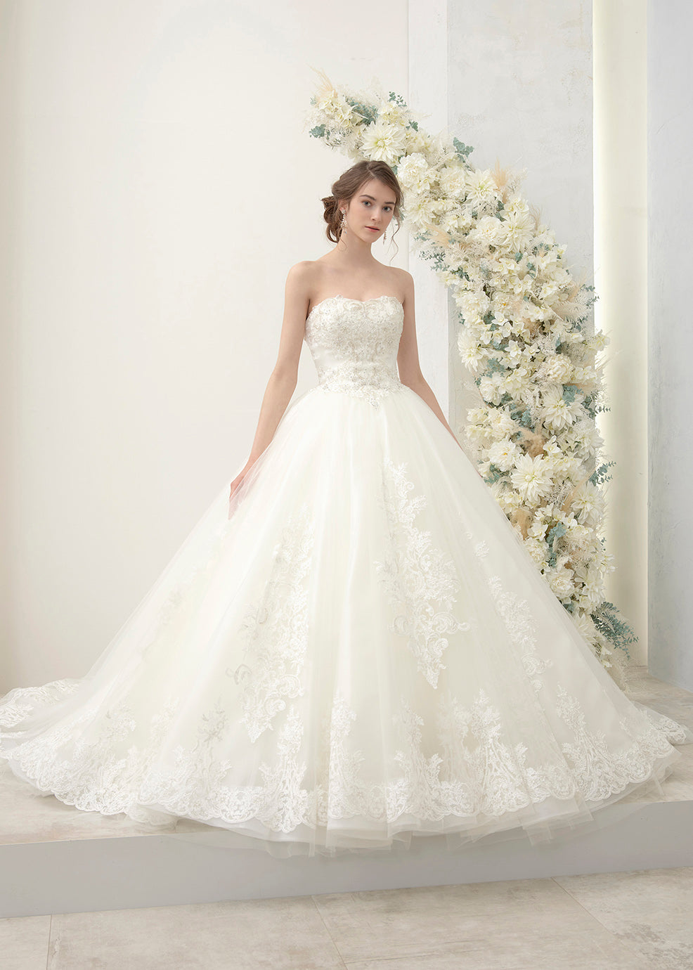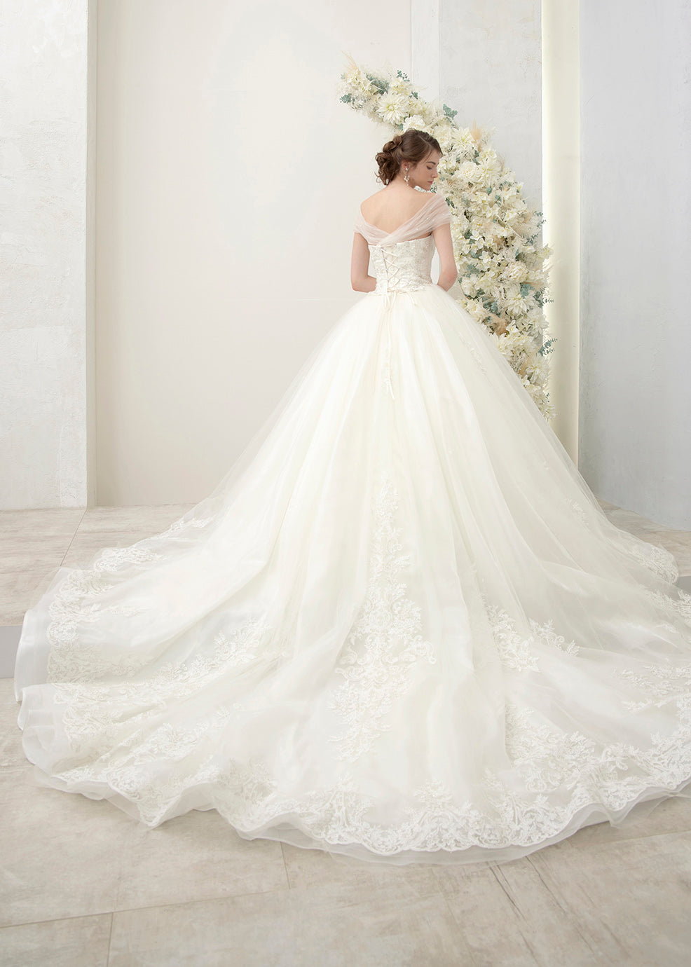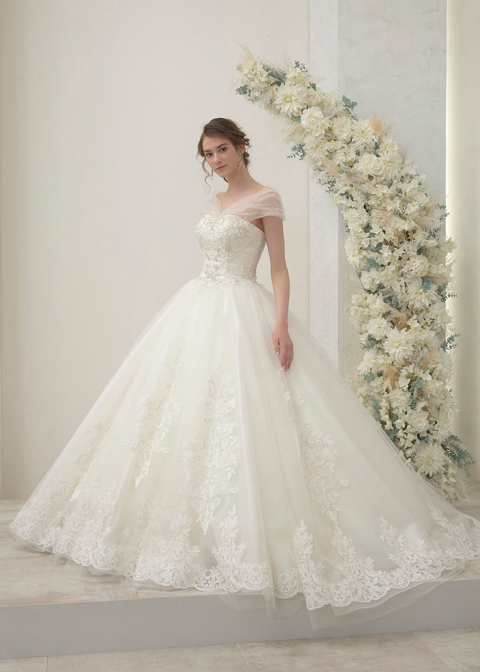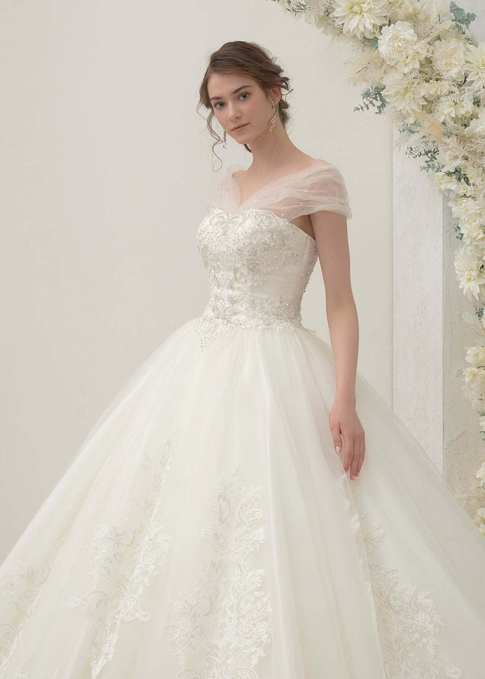 투명한 필름 코드를 사용한 반짝이는 입체 레이스가 특징인 드레스. 뉘앙스 컬러로 피부 친숙함을 좋아하고 어깨 주위를 부드럽게 감싸도록 마무리했습니다.