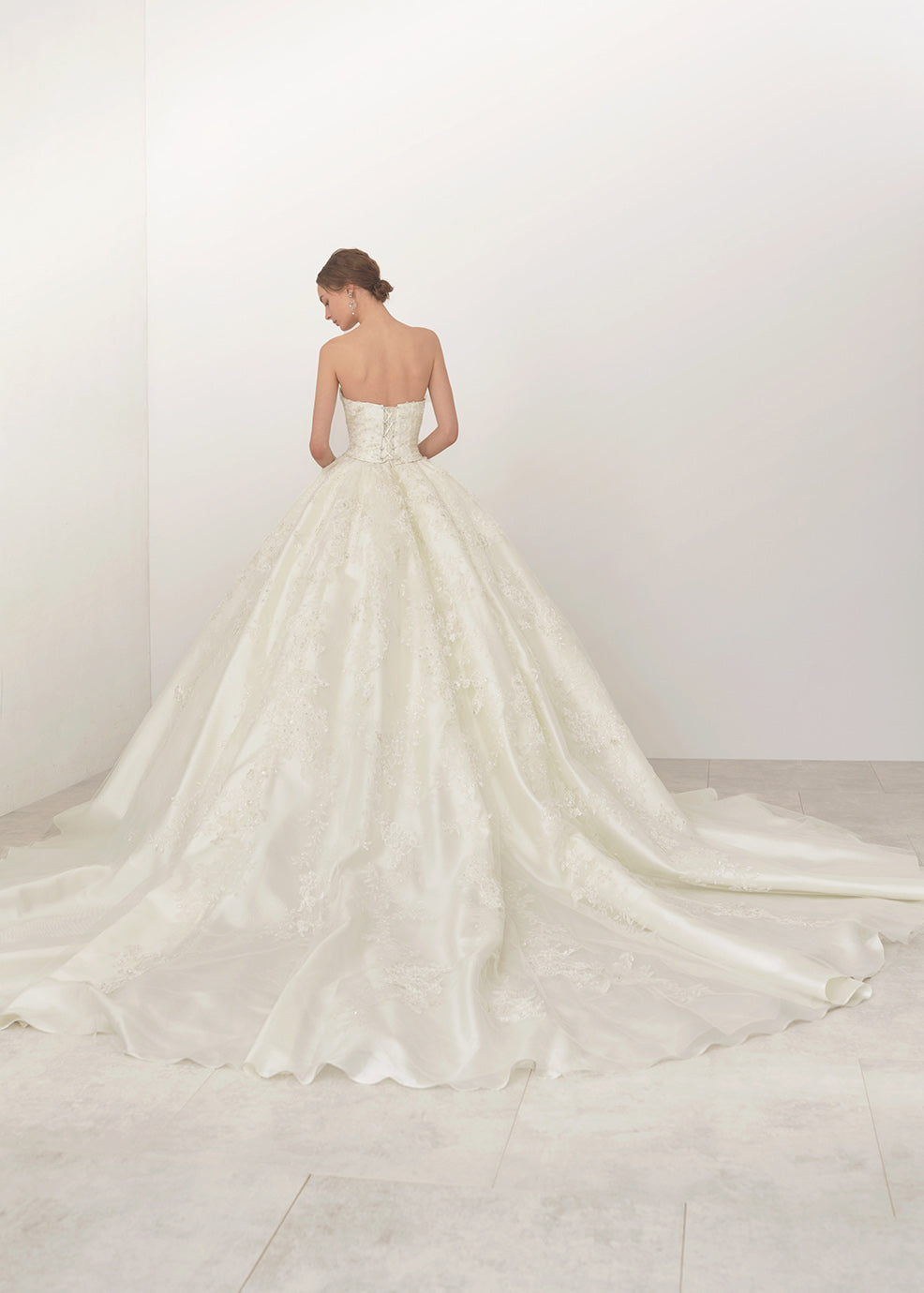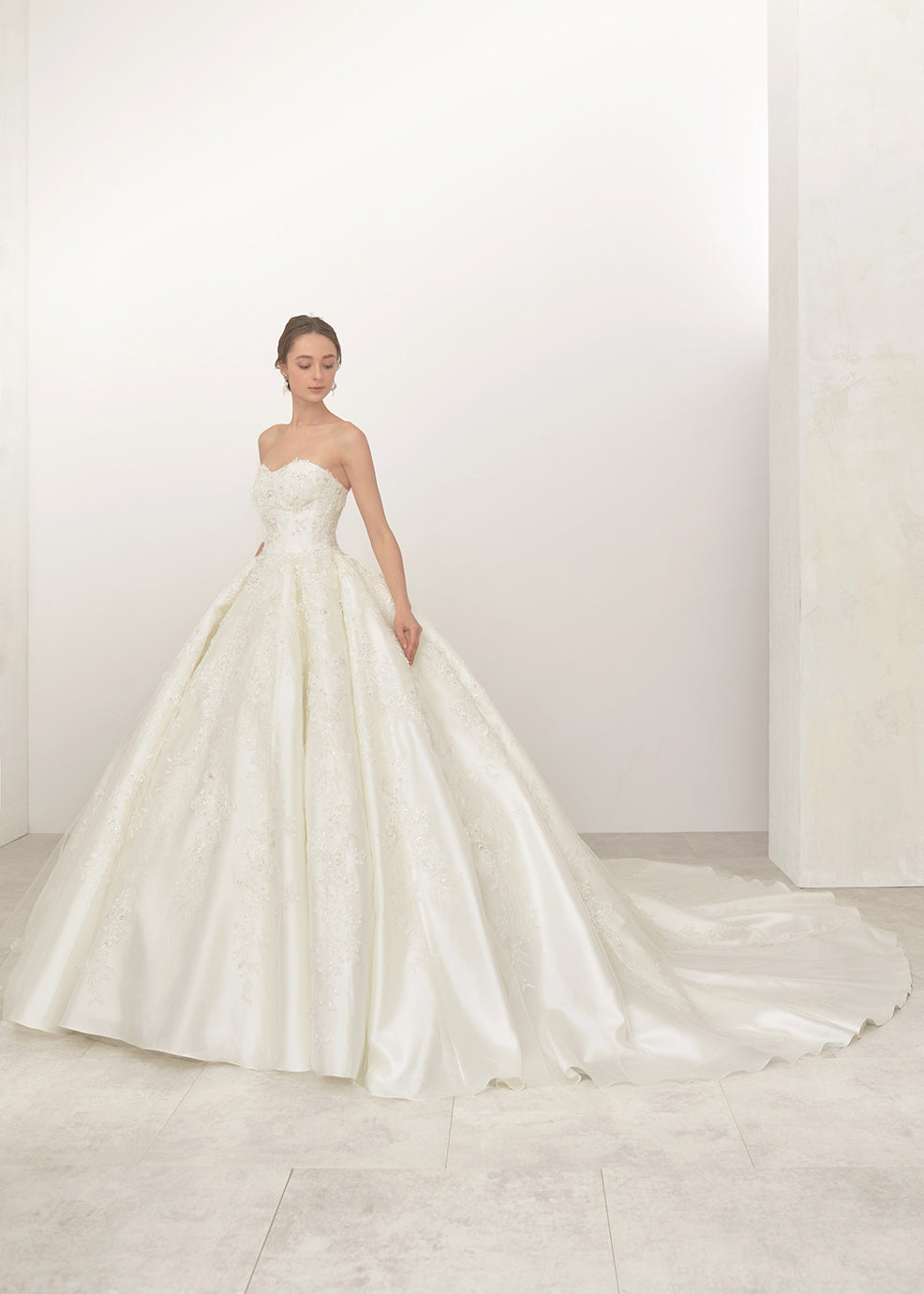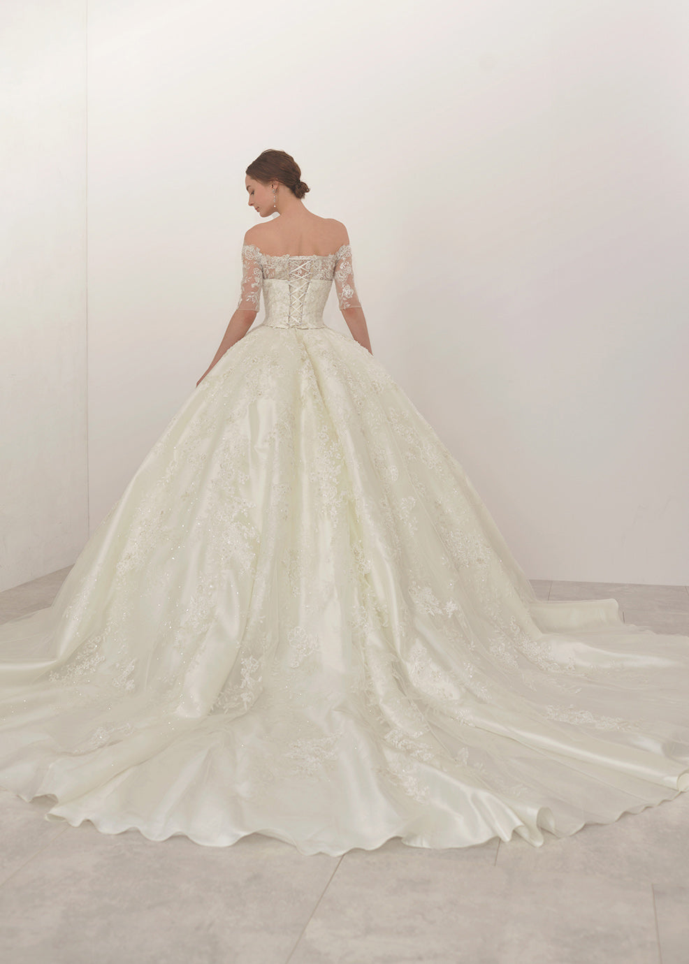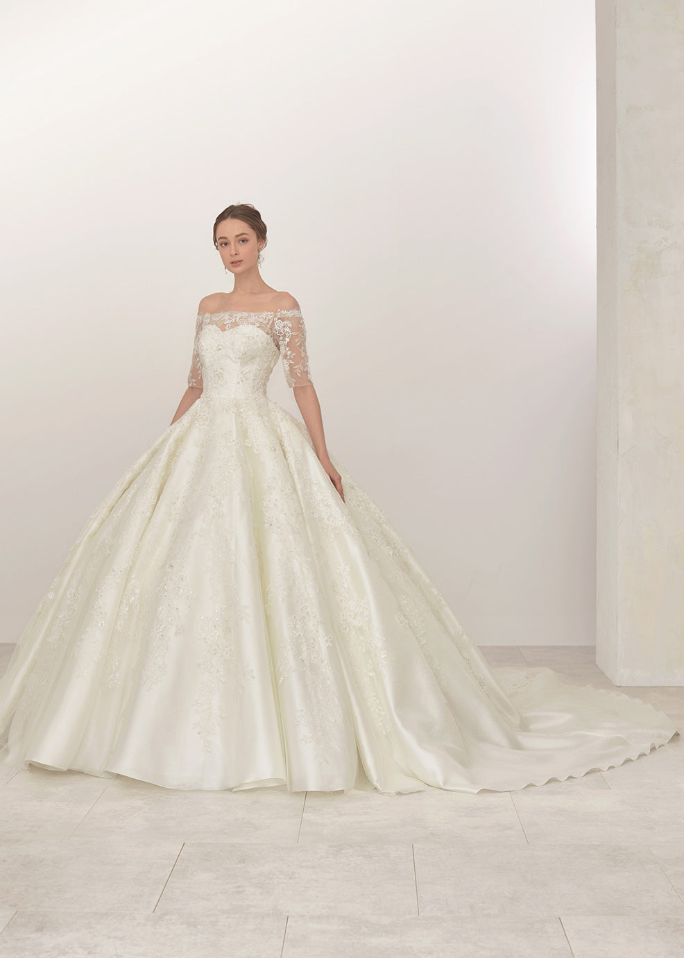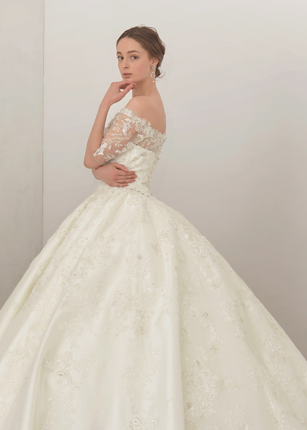 왕도의 클래식한 디자인에 아라베스크 무늬를 스팽글로 표현한 레이스가 신선함을 연출.롤 컬러는 드레이프를 만들어, 데코르테 주위를 부드러운 인상으로 완성합니다. 인상이 됩니다.