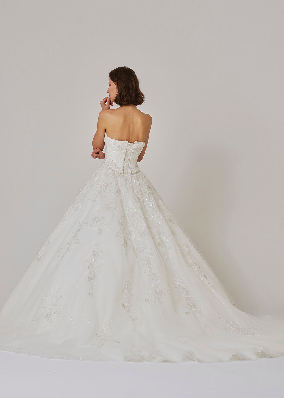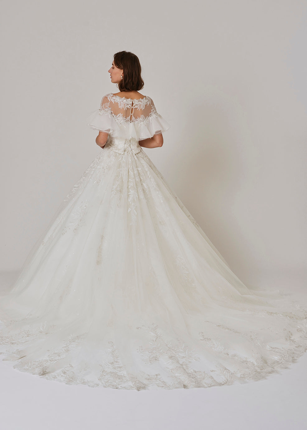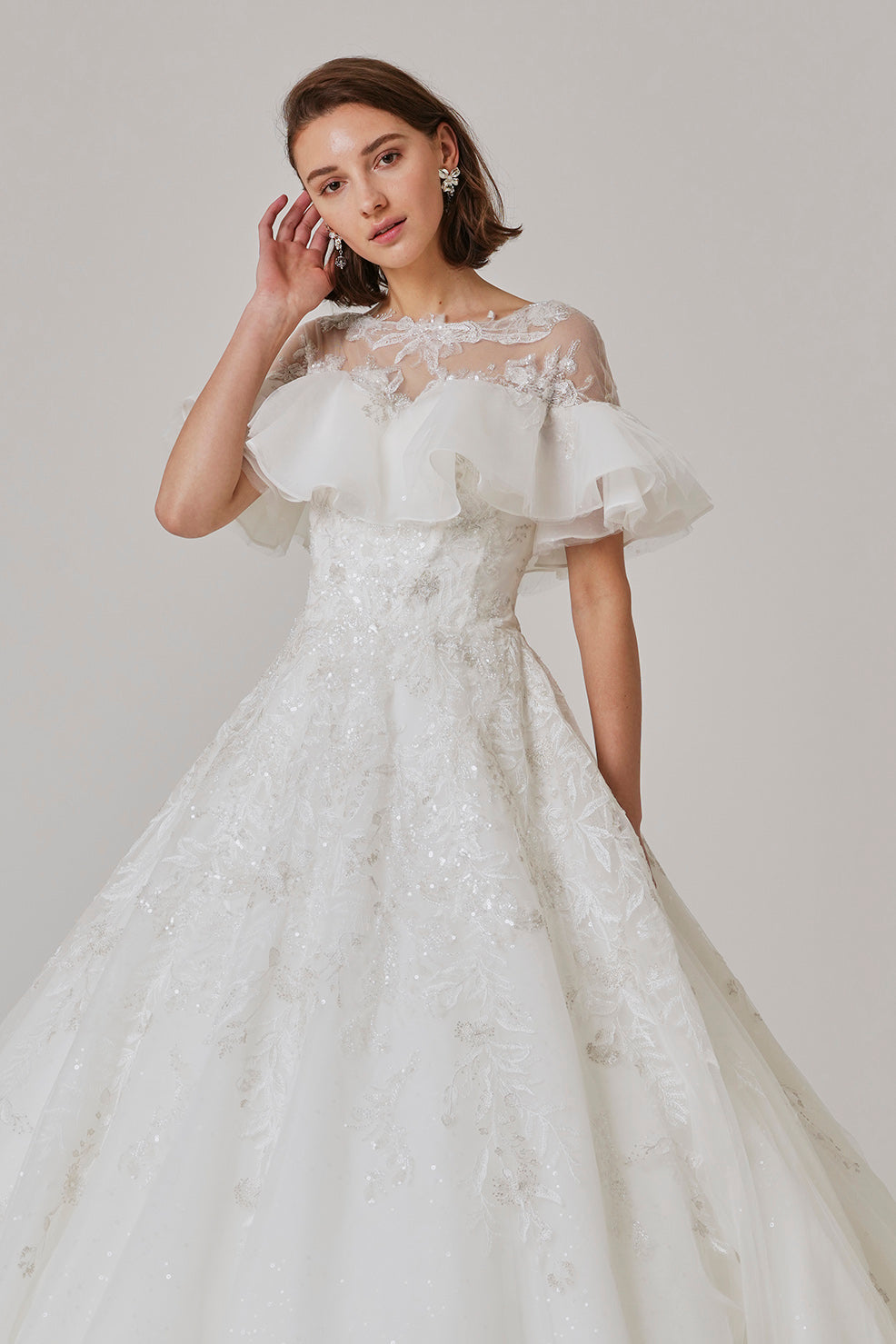 투명감 넘치는 프린세스의 빛을 표현한 드레스.전체에 투명 스팽글을 흩어져 몸길이나 스커트에 크리스탈의 비즈의 빛을 더해 화려함을 표현.라이트 골드의 자수 실을 사용한 보타니컬풍 레이스로 개성을 표현합니다. 탈착식의 프릴 첨부 요크를 붙여 주시면 귀여움이 업합니다.