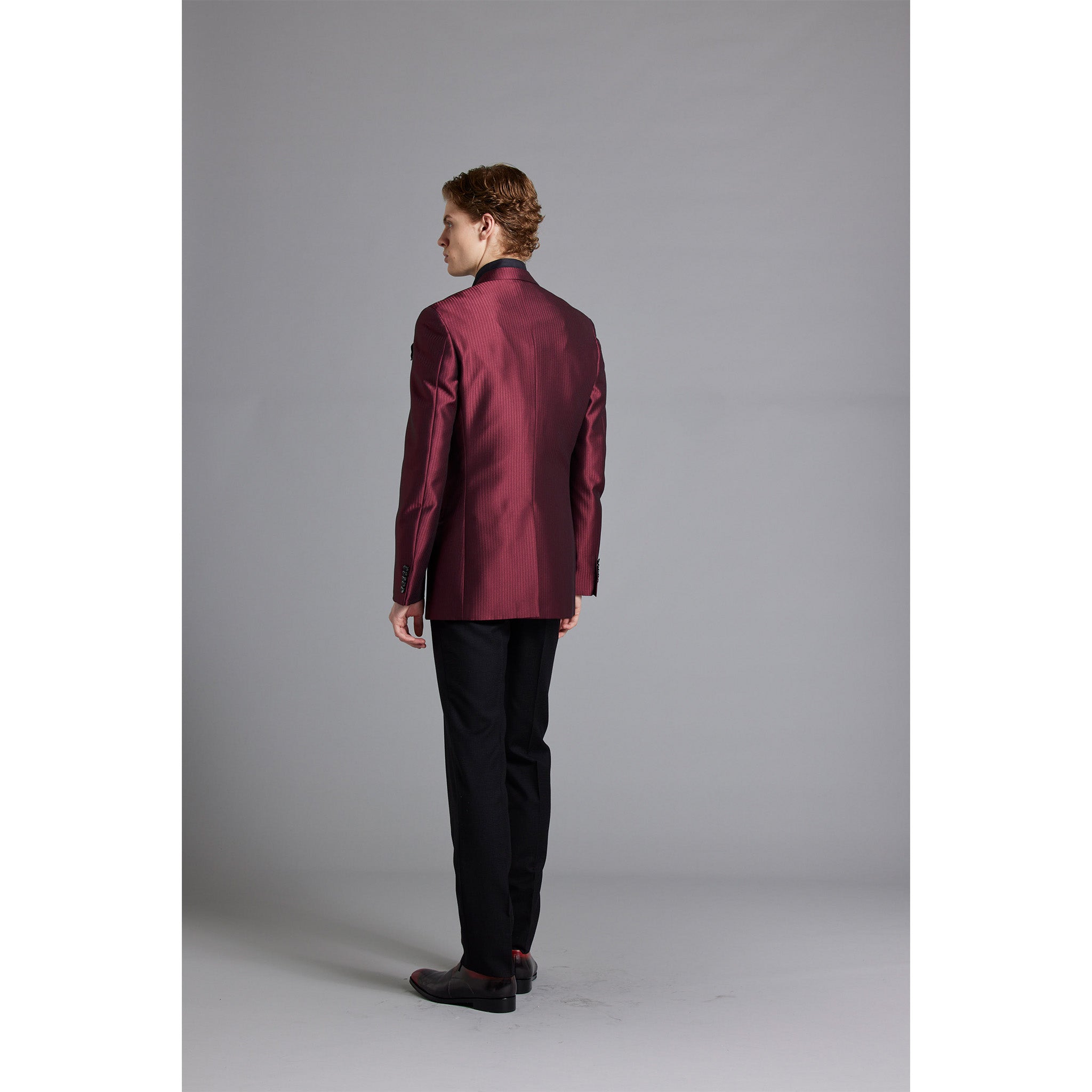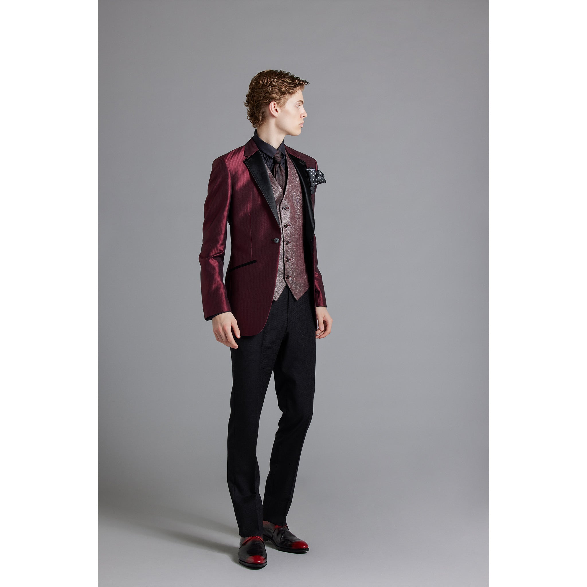 ブラックサテンのラペルを合わせたミニマムなジャケットと、細かなピンドット柄を用いたシンプルなパンツを合わせて着こなしやすくスタイリングしたジャケット&スラックススタイル。レストランやパーティー、ナイトウエディングなどに映える人品です。