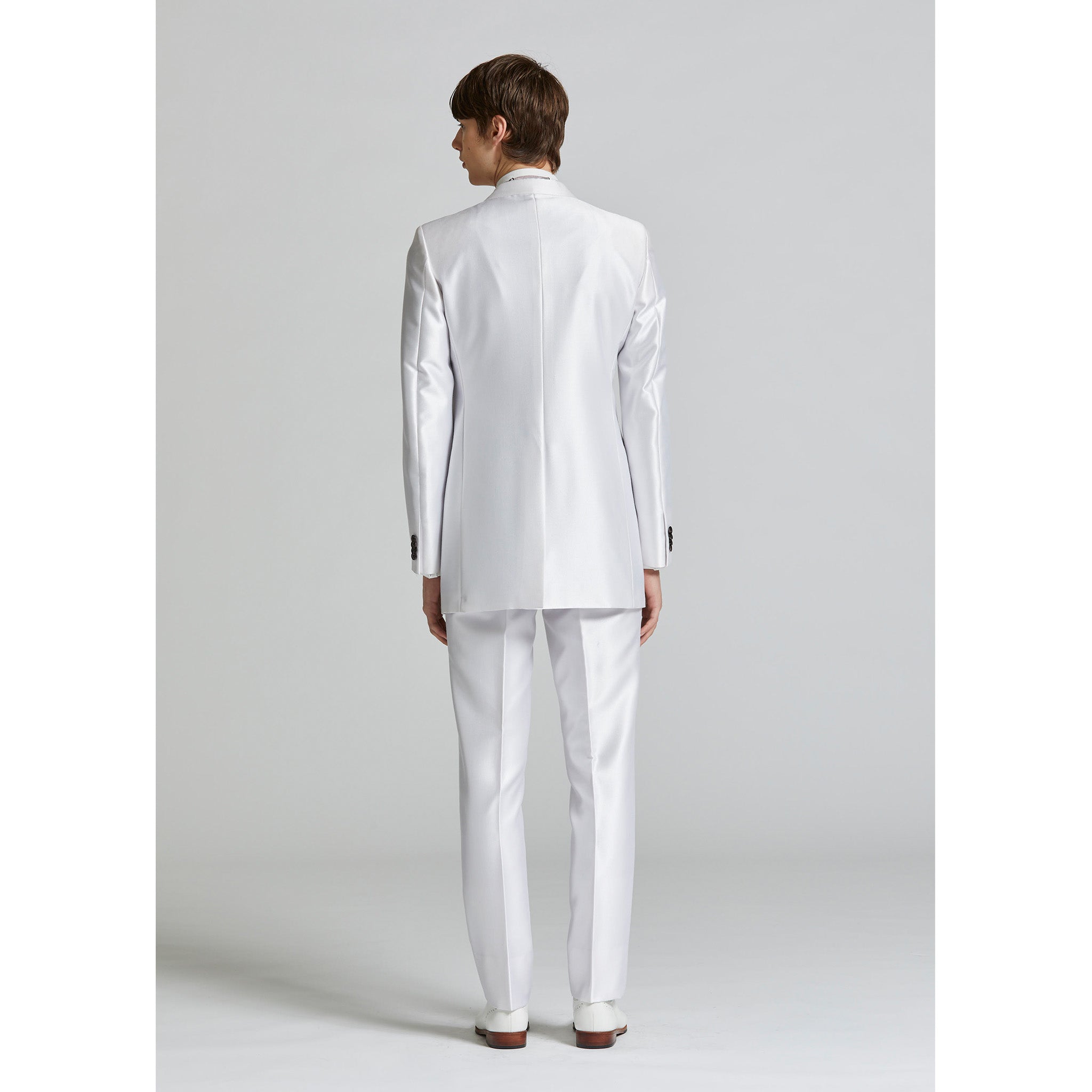 限りなく白に近いニュアンスカラーが印象的。ほんのりとラベンダーカラーが混ざった独特の光沢素材が、優しいオーラを纏ったタキシードに仕上げています。くすんだパープルのベストと、艶感の美しいタイのコンビネーションが大人の色気を演出。カラードレスとの相性も抜群です。
