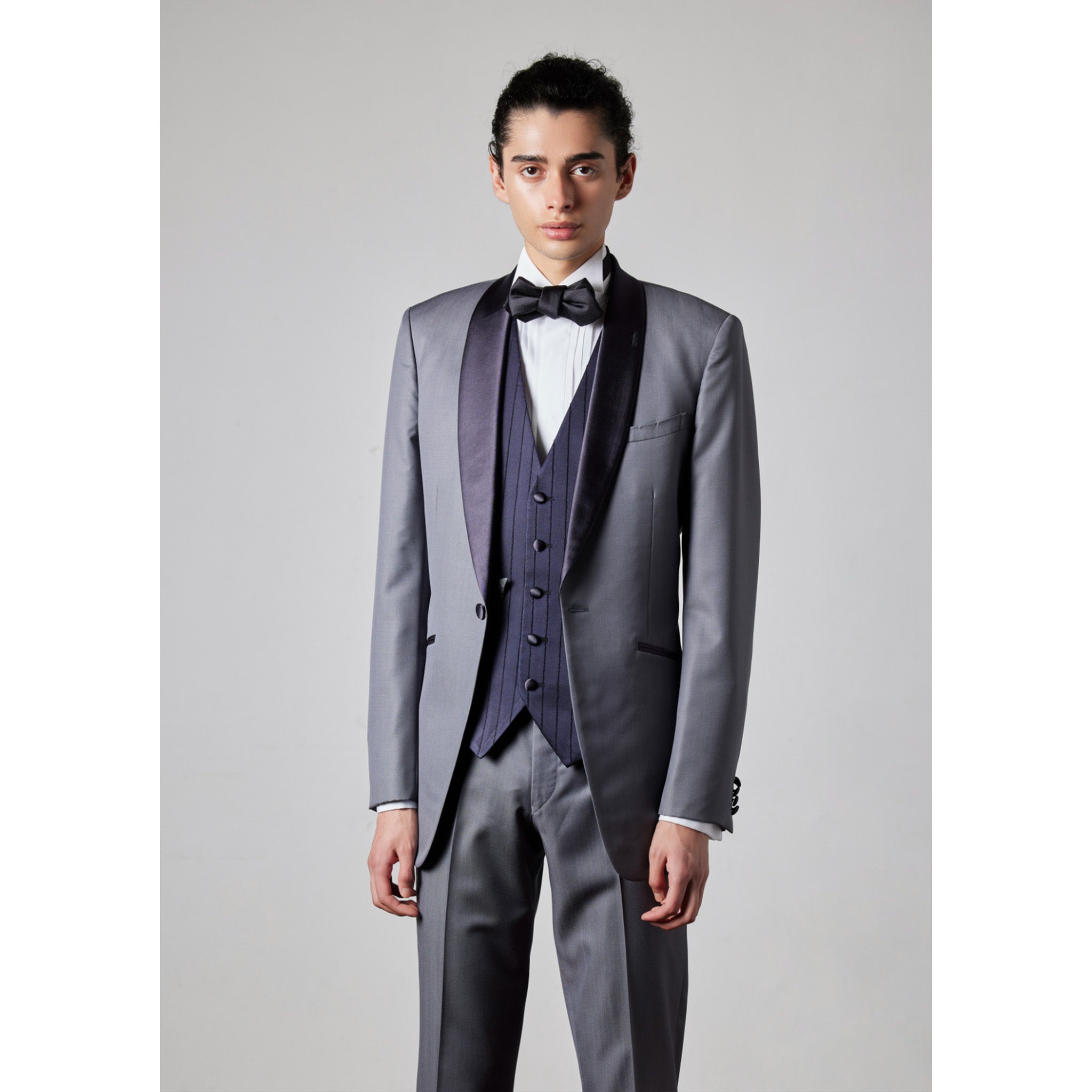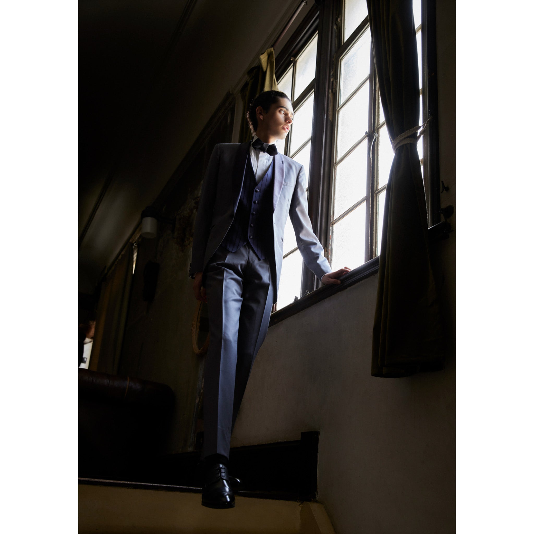 繊細で手触りのよいウールで仕立てた上質なタキシード。きめ細かな優しい着心地で新郎を包み込む。ニュアンスのあるエバーグレーのカラーリング、美しいボディラインを描くシルエットをドーメル社最上級の素材で、紳士のエレガンスを醸す仕上がりに。