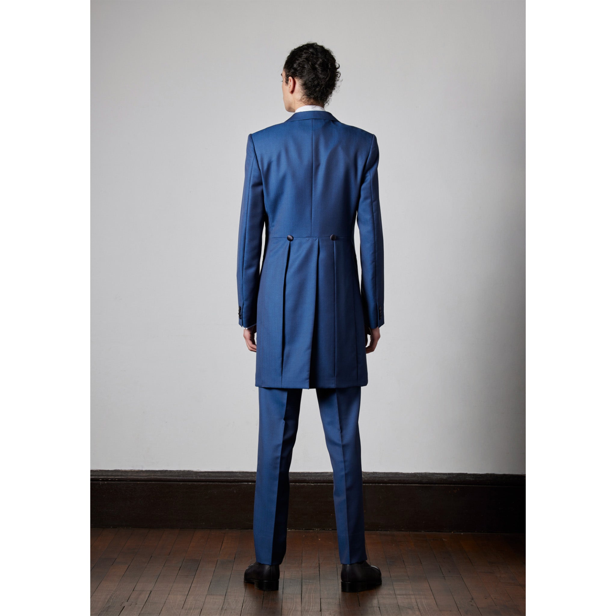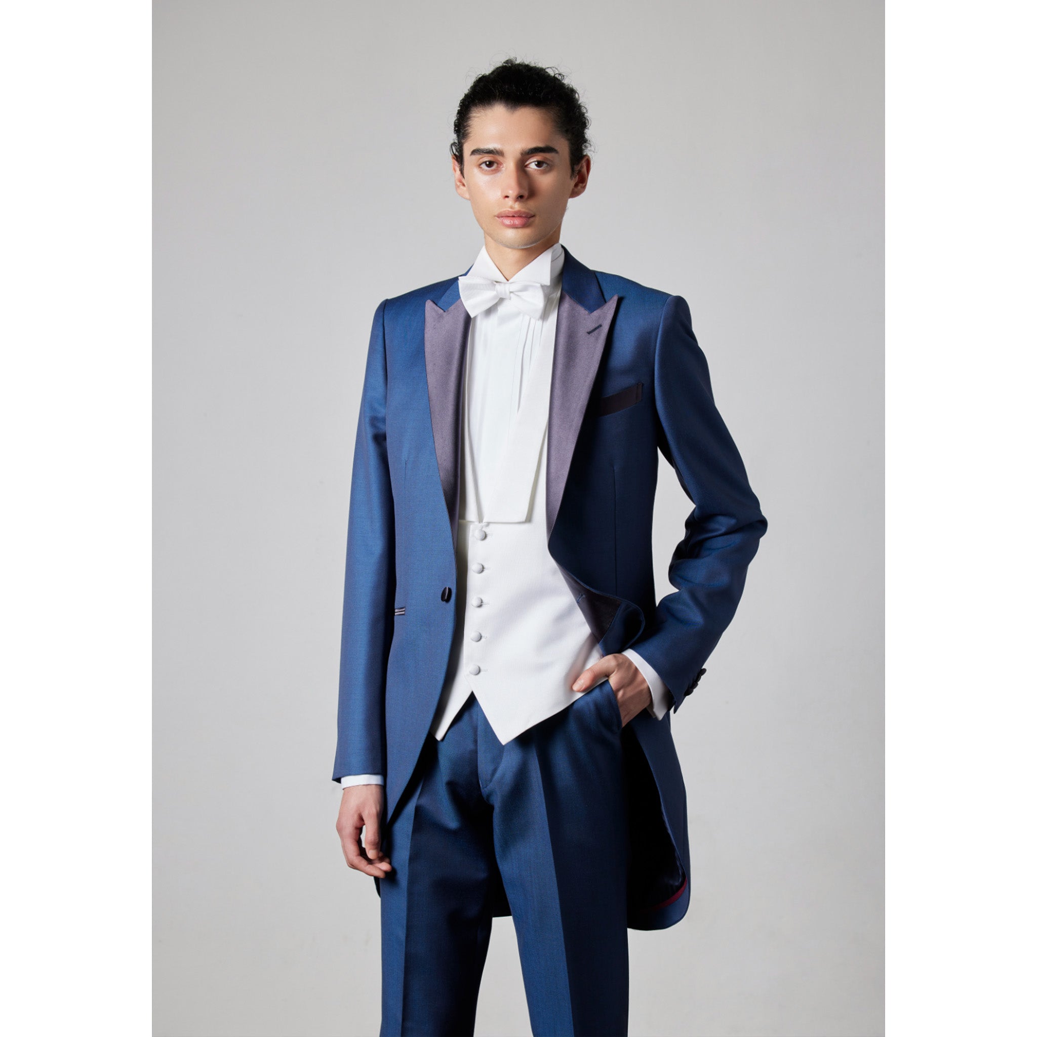 アンゴラの中でも希少価値の高いキッドモヘアを織り込んだ上質な生地を使用。滑らかな肌触りとロイヤルサックスブルーの美しい発色で挙式にふさわしい特別な存在感を醸し出すモーニングコート。品格のある正装にエレガンスと華やかさが宿った魅力あふれる一着です。
